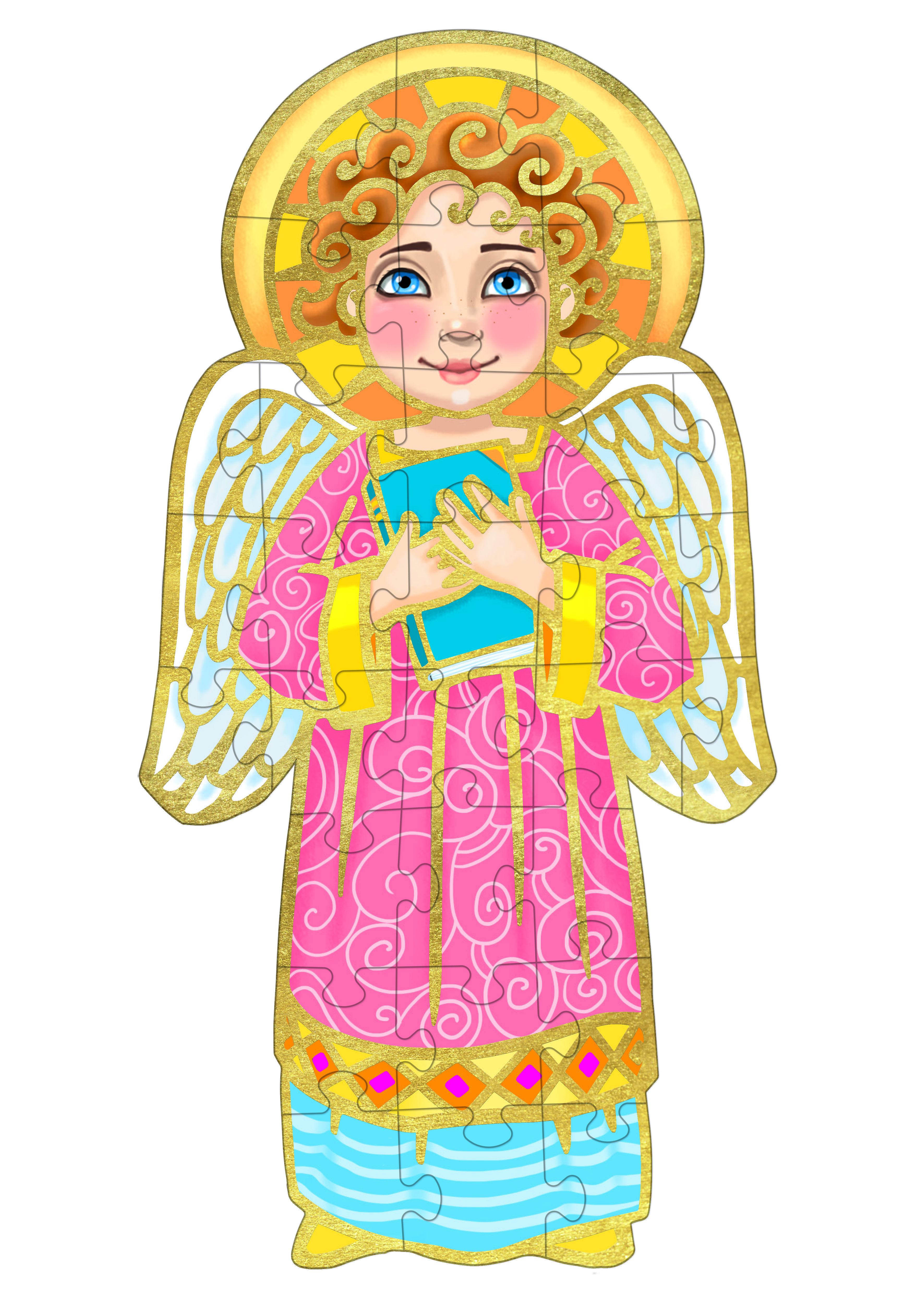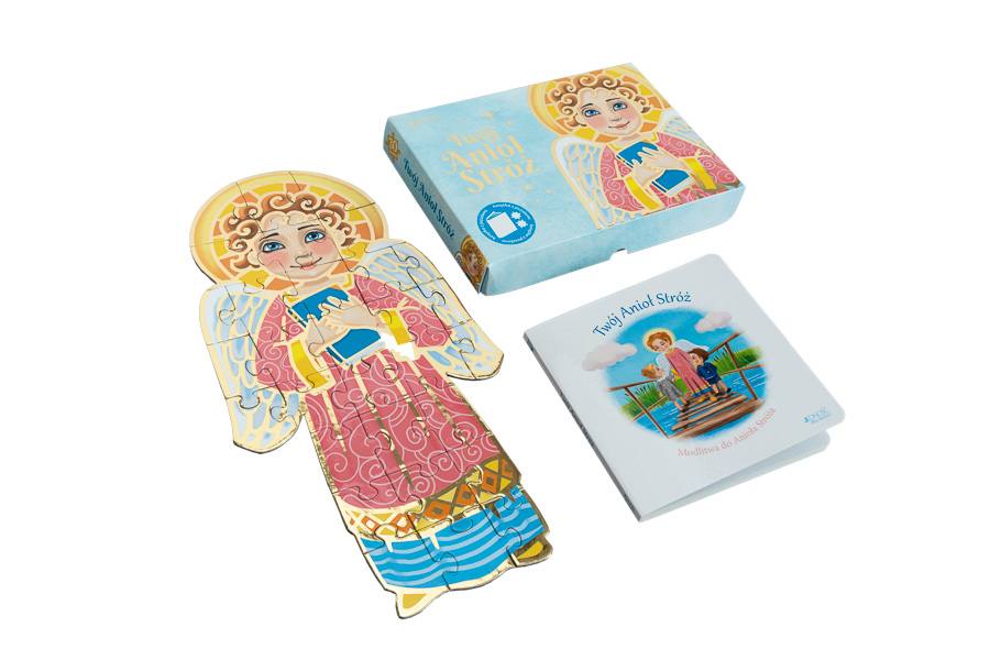 „Twój Anioł Stróż” to piękny upominkowy zestaw w ozdobnym pudełku, idealny jako prezent z okazji świąt, urodzin, chrztu lub innych ważnych uroczystości w życiu dziecka. Zawiera kartonową książeczkę z modlitwą „Aniele Boży…” oraz wysokiej jakości 30-elementowe złocone puzzle, z których maluch ułoży postać Anioła Stróża. Pełne ciepła, kolorowe ilustracje zachęcają najmłodszych do sięgania po ten zestaw i zanoszenia ufnej modlitwy każdego dnia.