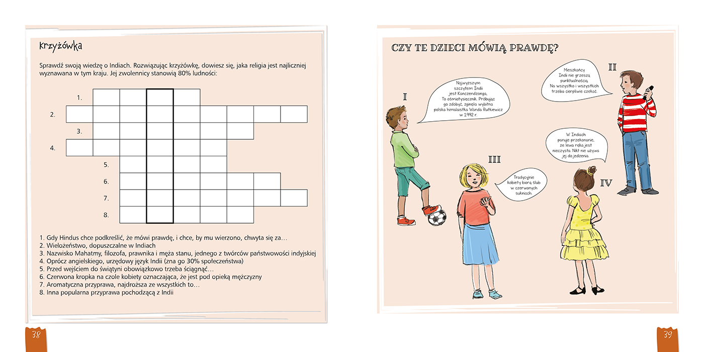 Dla ceniących dobrą zabawę i główkowanie na kolorowych stronach publikacji nie zabraknie quizów, zgadywanek i krzyżówek, dzięki którym wiele interesujących faktów w mig wpadnie do dziecięcych głów.