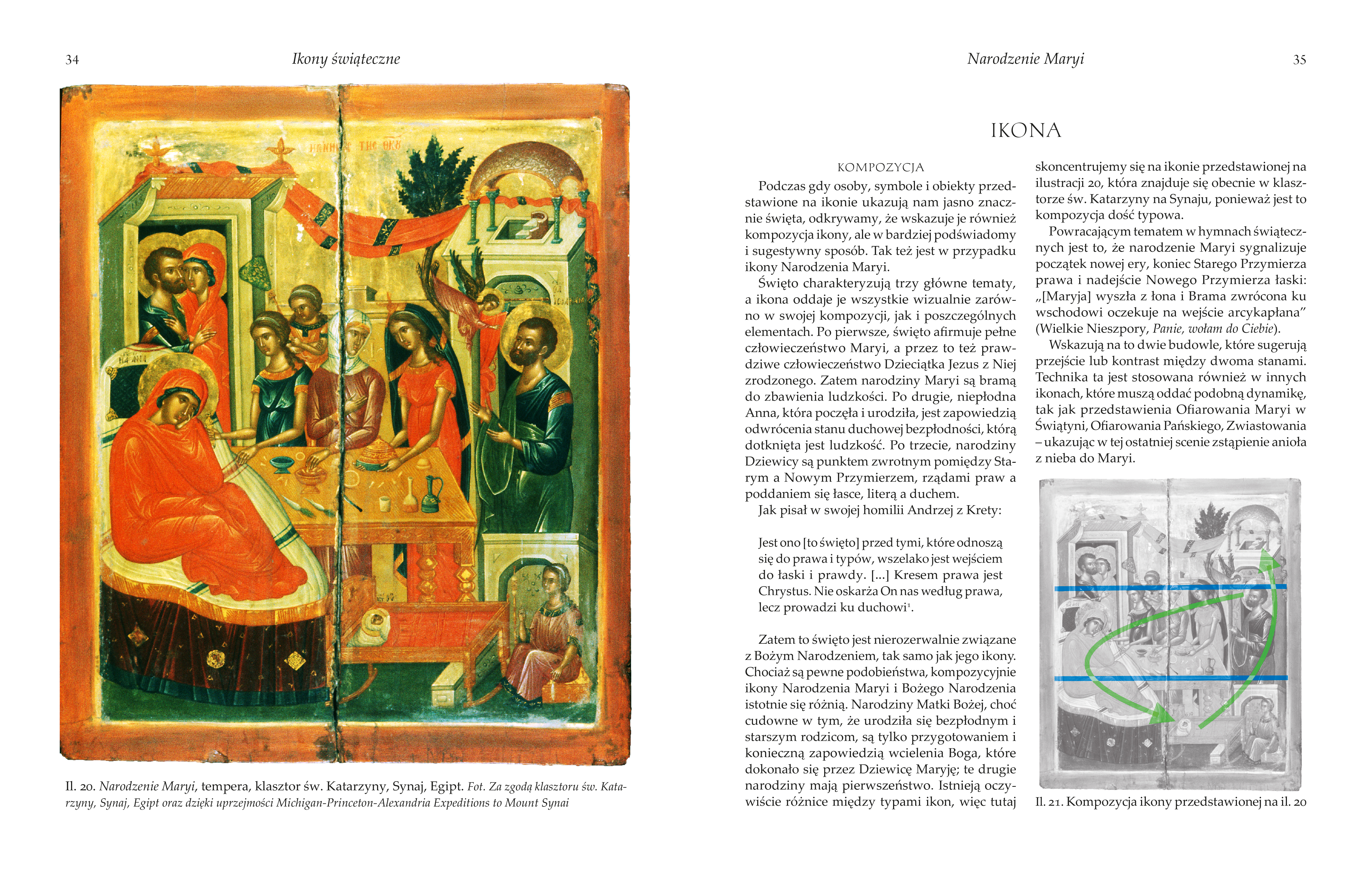 Dlaczego warto przeczytać tę książkę: Czytelnik ma okazję zrozumieć symbolikę ikon świątecznych, zapoznając się z myślą znanego artysty i nauczyciela sztuki ikonowej. Liczne kolorowe ilustracje znanych ikon, w tym dzieł autora, ubogacają książkę.
