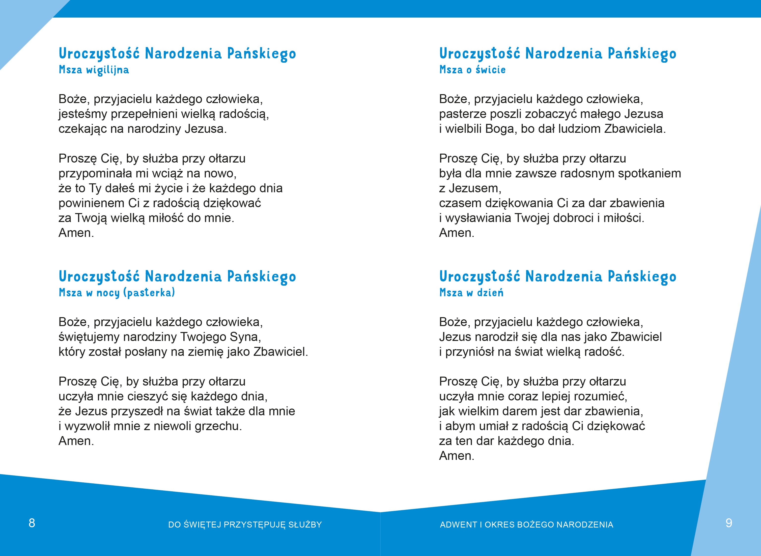 Do każdej Mszy Świętej ministranci przygotowują się, odmawiając modlitwę. Oprócz zwyczajowych formuł, które prawdopodobnie znają na pamięć, mogą również wykorzystać teksty zaproponowane w tym modlitewniku, dopasowane do wszystkich niedziel i najważniejszych świąt w ciągu roku liturgicznego. Są wśród nich również modlitwy przygotowane na Msze okolicznościowe, odprawiane w czasie takich wydarzeń jak Pierwsza Komunia Święta, ślub czy początek roku szkolnego. Przez nakierowanie myśli na to, co jest istotne w danym dniu, modlitwy te pozwolą wszystkim służącym przy ołtarzu lepiej przeżyć każdą Eucharystię.
