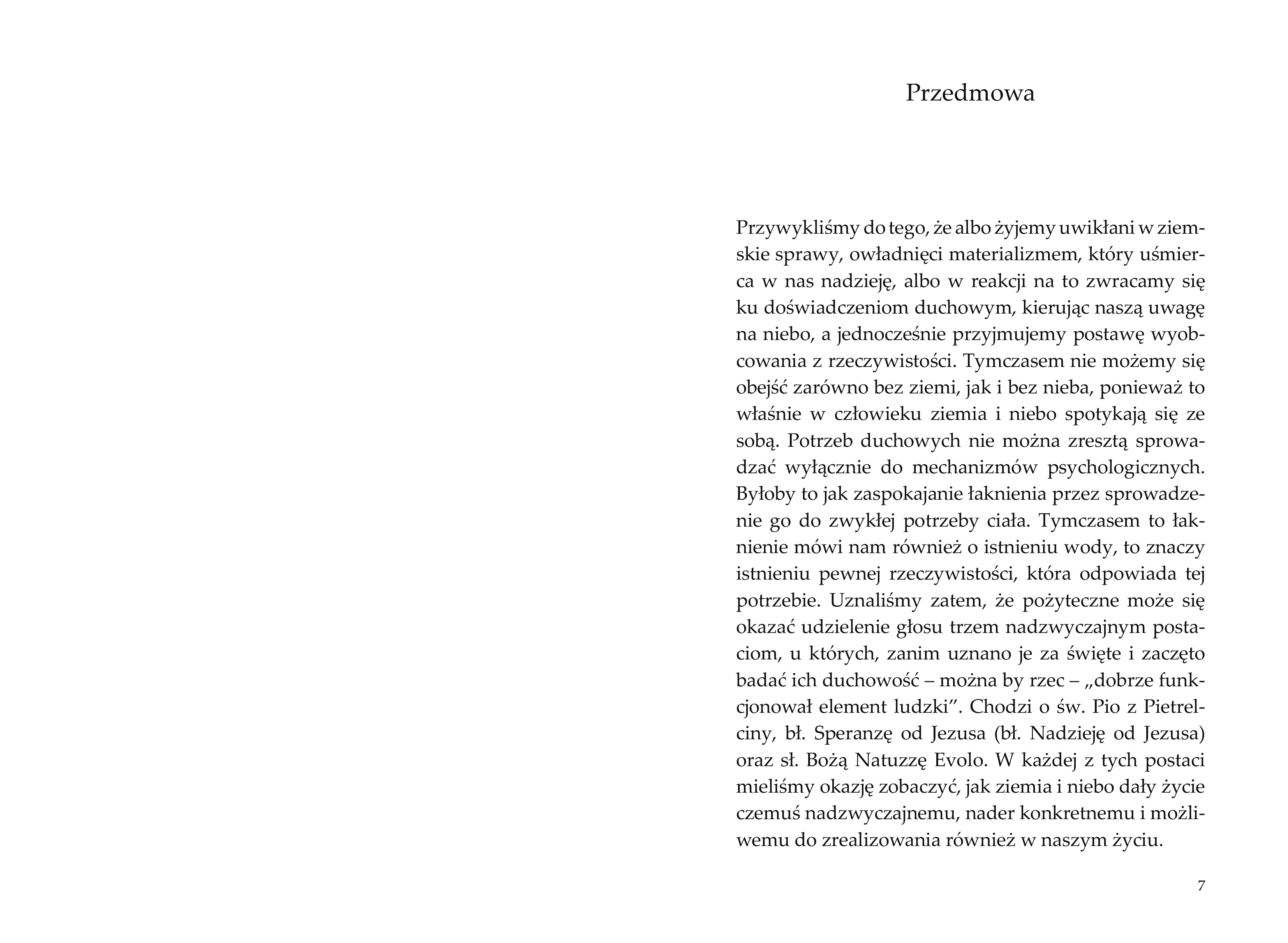 Dlaczego warto przeczytać tę książkę: publikacja przybliża mało znane w Polsce postacie Natuzzy Evolo i matki Speranzy oraz ich współpracę z ojcem Pio. Fabuła pełna niezwykłych wydarzeń z ich życia, cudów, dzieł miłosierdzia, cierpienia i walki z mocami ciemności – to porywająca lektura o wielkiej miłości Boga do człowieka i o tych, którzy odpowiedzieli na nią w sposób heroiczny. Trzyma w napięciu do ostatniej strony.