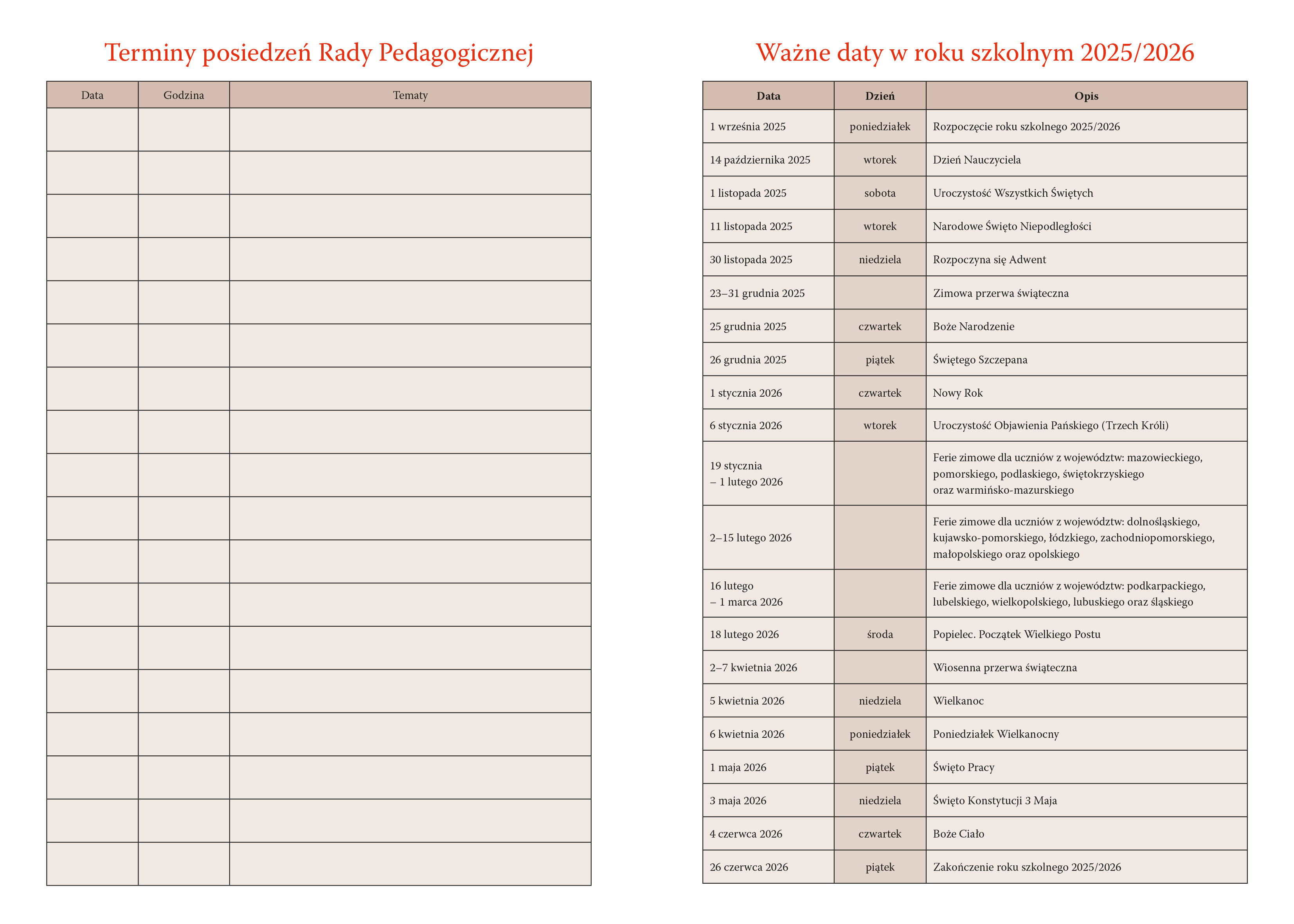 – miejsce na wpis terminów posiedzeń Rady Pedagogicznej,