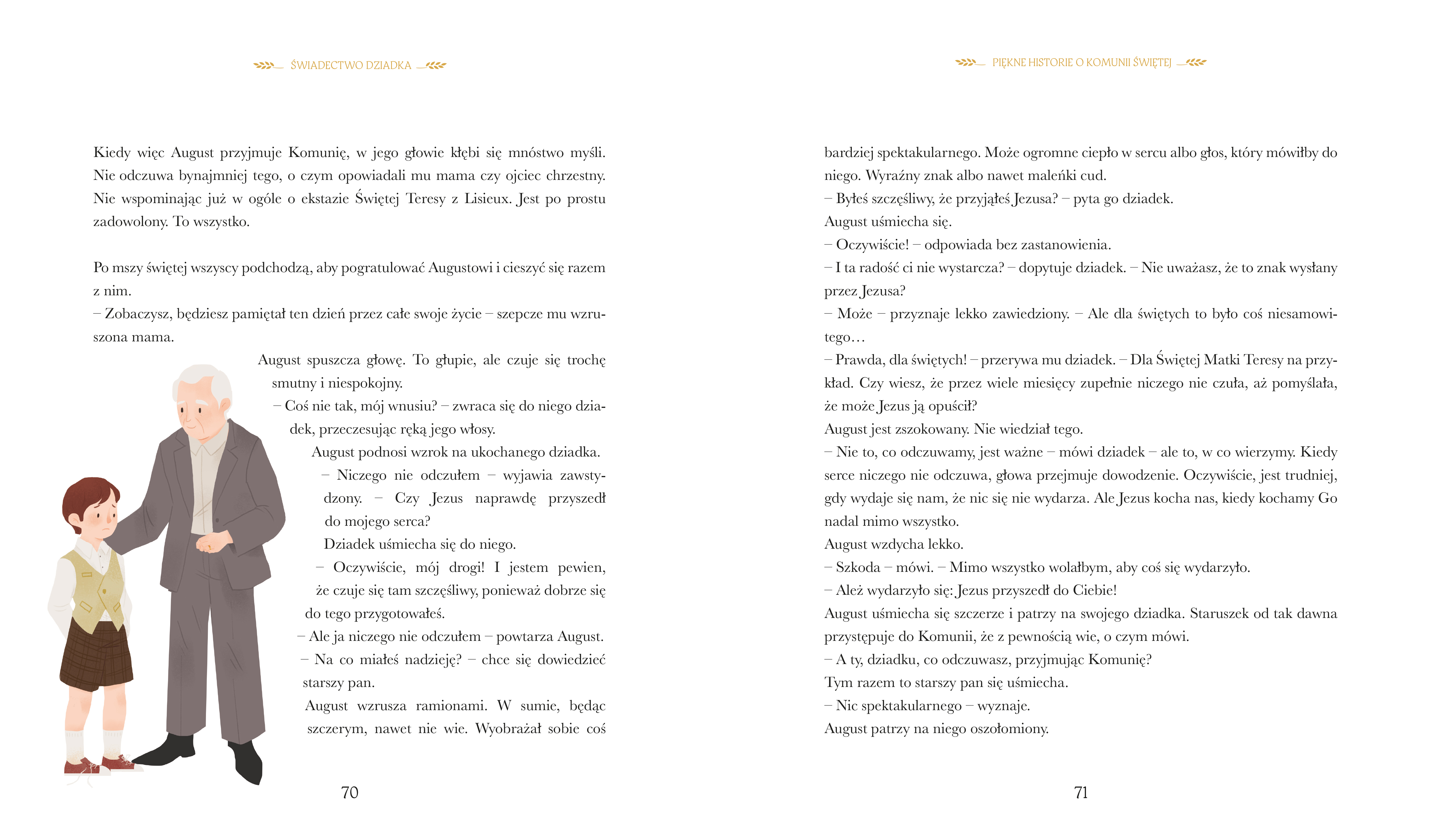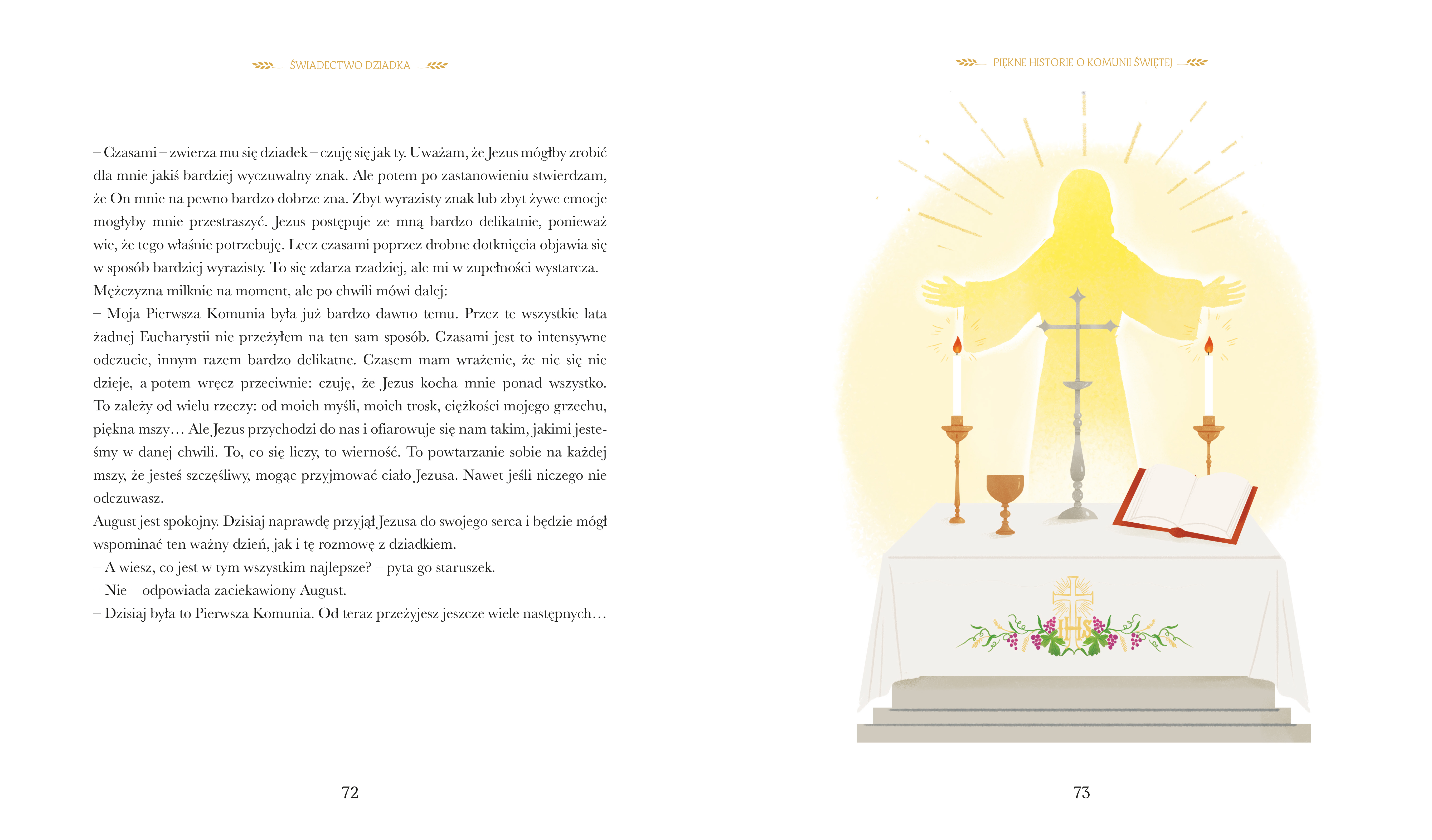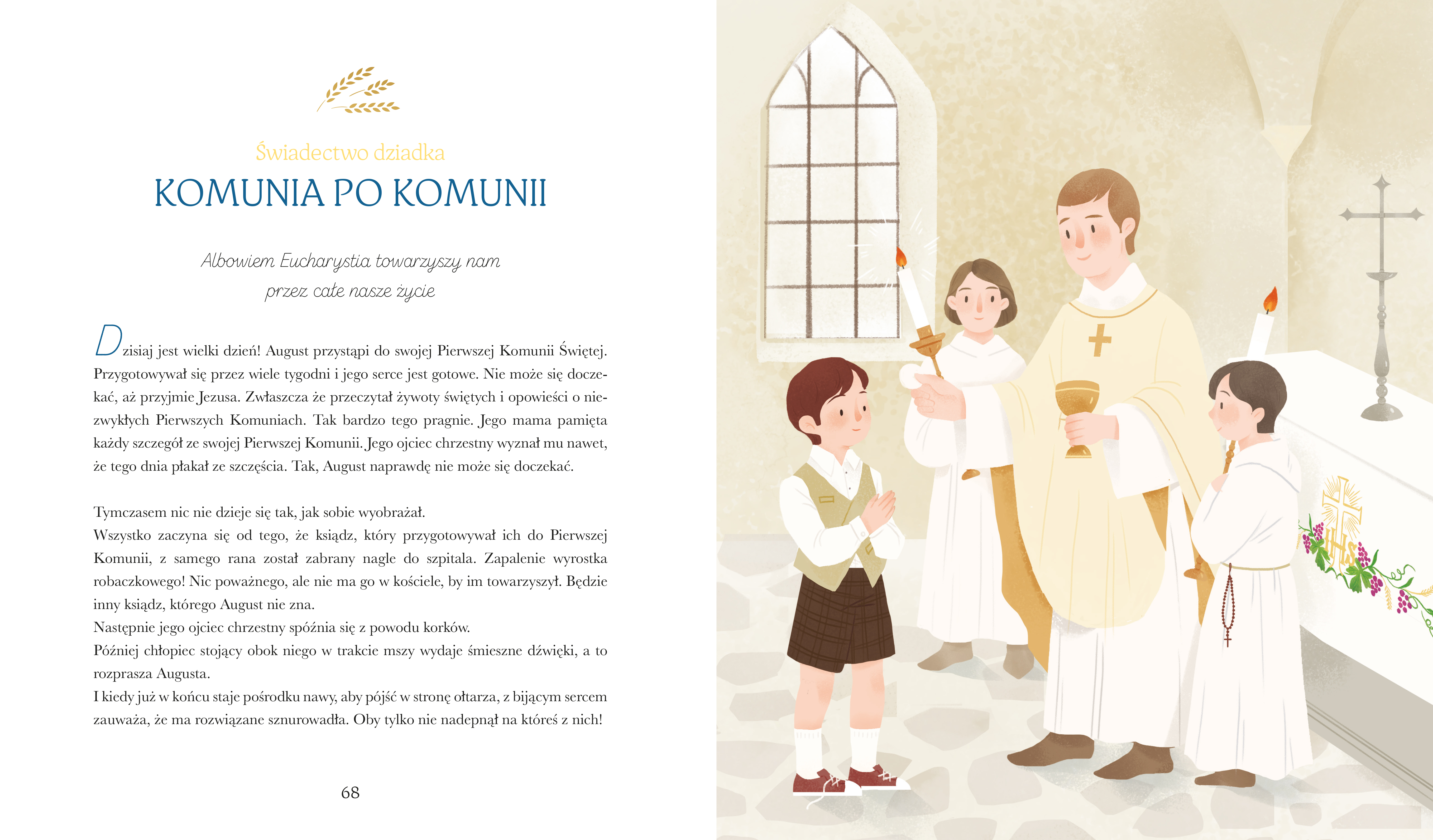 Historie te pokazują ogromną miłość Jezusa do ludzi i pomagają dziecku rozbudzić w sobie miłość do Eucharystii. Aby pokochać Komunię Świętą, trzeba zrozumieć jej znaczenie i poczuć, jak wielkim jest skarbem! Opowieści inspirowane życiem świętych, ale także życiem codziennym, pozwalają docenić wszystkie łaski, które działają podczas tego sakramentu. Na końcu książki znajdziemy piękne modlitwy, pielęgnujące dar wiary.