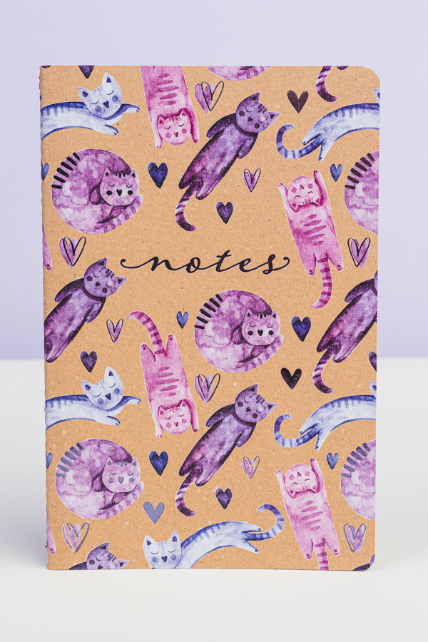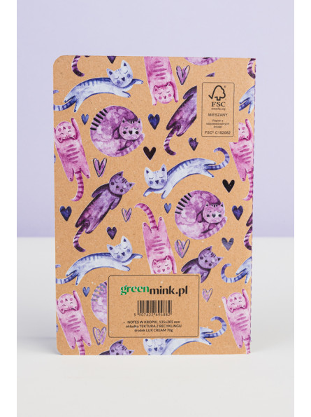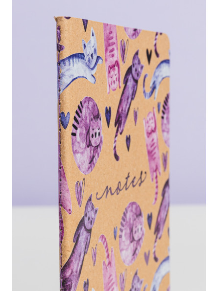 Okładki notesu z ilustracją kotów i serduszek oraz subtelnie tłoczone elementy grafiki i napisy, tworzą piękne zestawienie z naturalną tekturą. Kolor nici, pierwszej i ostatniej strony notesu uzupełniają stylowy wygląd notesu.