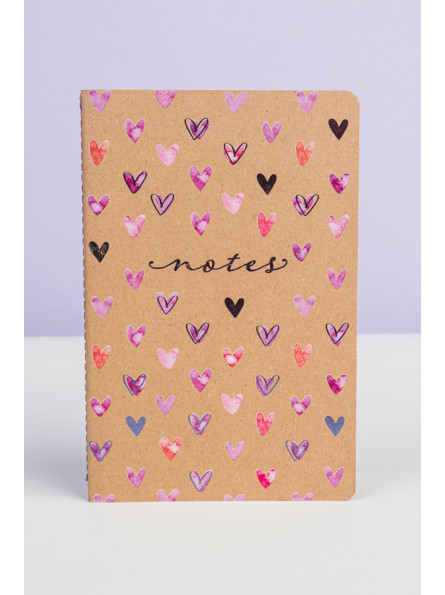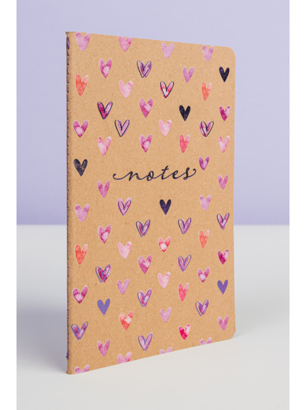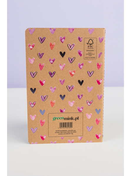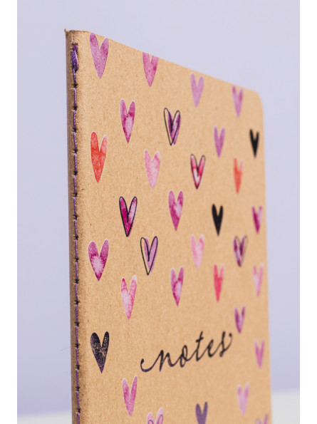 Okładki notesu z ilustracją serduszek oraz subtelnie tłoczone elementy grafiki i napisy, tworzą piękne zestawienie z naturalną tekturą. Kolor nici, pierwszej i ostatniej strony notesu uzupełniają stylowy wygląd notesu.