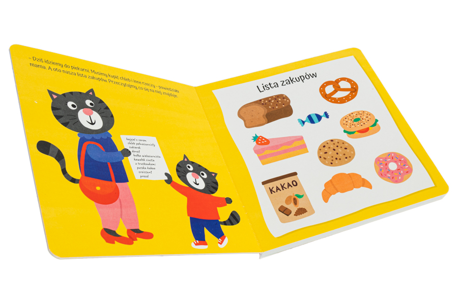 Mama narysowała małemu Kotkowi listę zakupów i razem wybierają się do piekarni. Mały czytelnik będzie miał okazję obserwować pracę piekarza, pozna różne rodzaje wypieków i porówna je z listą zakupów. Chleb pszenny czy razowy? Bułka wieloziarnista czy bagietka? Pączek czy babeczka? Sprawdźmy, czy to, co wybierze Kotek znajduje się na liście zakupów!