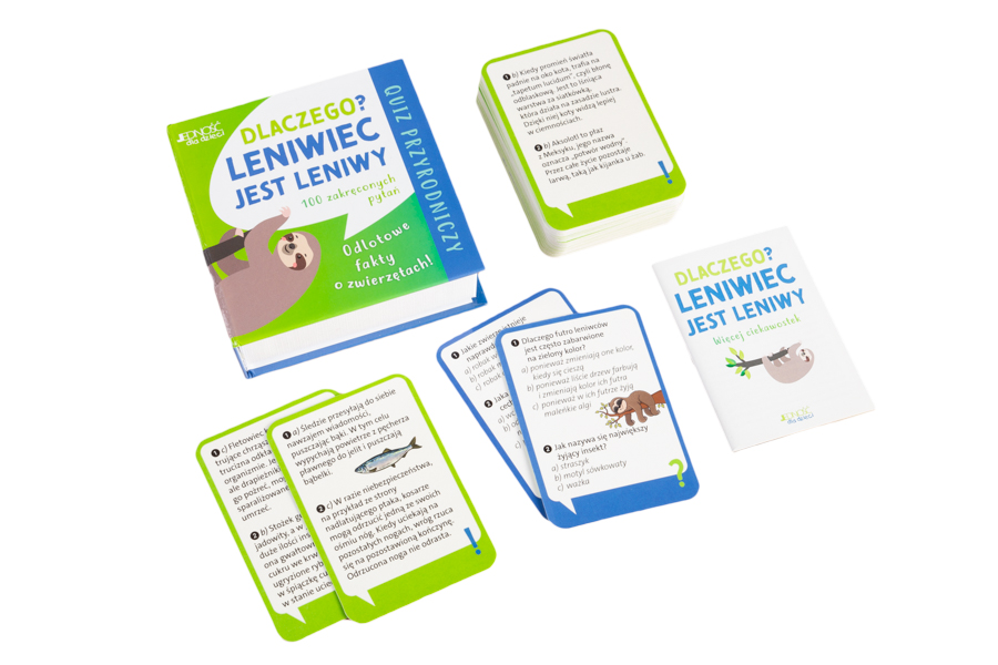 „Quiz przyrodniczy. Dlaczego leniwiec jest leniwy?” to kopalnia wiedzy o zwierzętach i rewelacyjna zabawa dla dzieci. Jazda samochodem, wakacyjny relaks na plaży, długie jesienne wieczory czy lekcja przyrody… to tylko niektóre okazje, na które nasz quiz jest po prostu niezbędny!