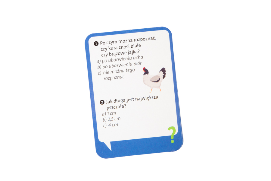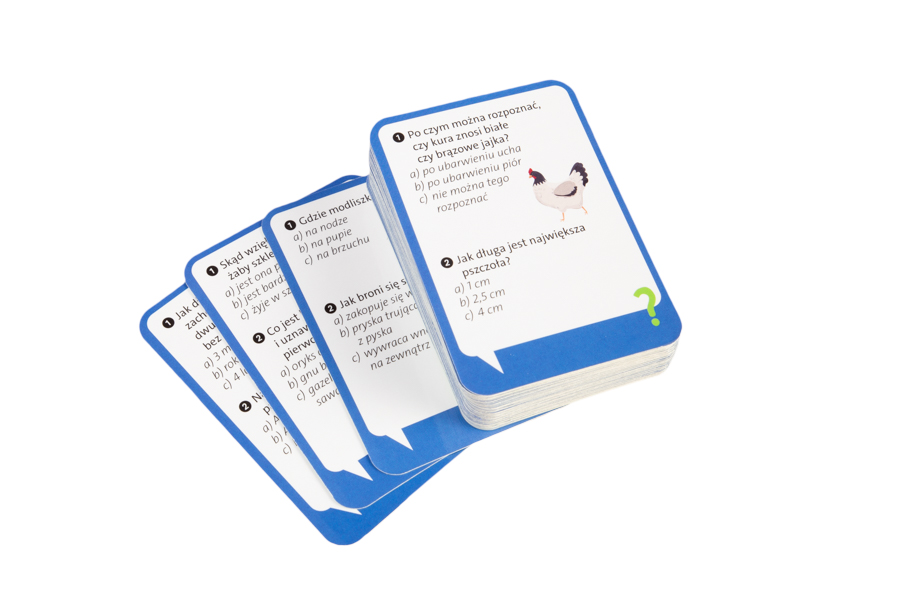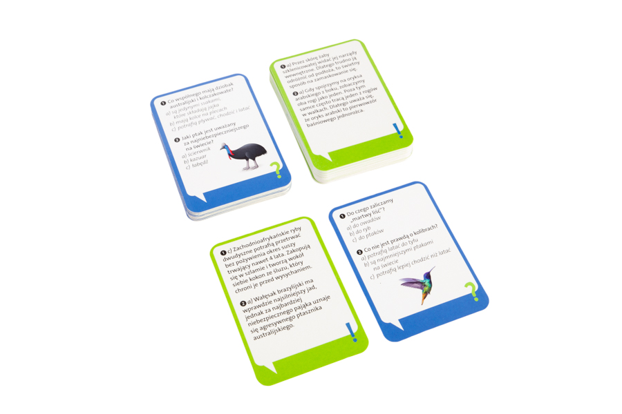 50 kart (opakowanych w kolorowe, solidne pudełko) i aż sto zakręconych, podchwytliwych pytań czeka na dzieci (8+), rodziców i nauczycieli. Nie ma na co czekać! Ruszajmy do zabawy i odkrywajmy sekrety zwierząt!