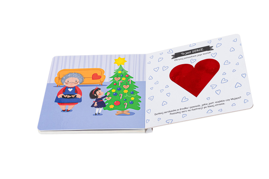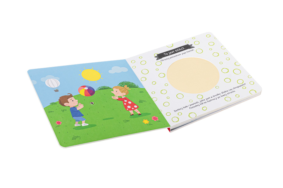 W środku książki znajduje się kilka materiałów różniących się wyglądem i fakturą. Proste polecenia zachęcają do zabawy w ich dotykanie i nazywanie. Na okładce została umieszczona obracająca się tarcza, którą dziecko może poruszać, by odnaleźć koło, kwadrat, trójkąt, gwiazdę lub serce i rzeczy w poszczególnych kształtach. To świetne ćwiczenia dla maluszków.