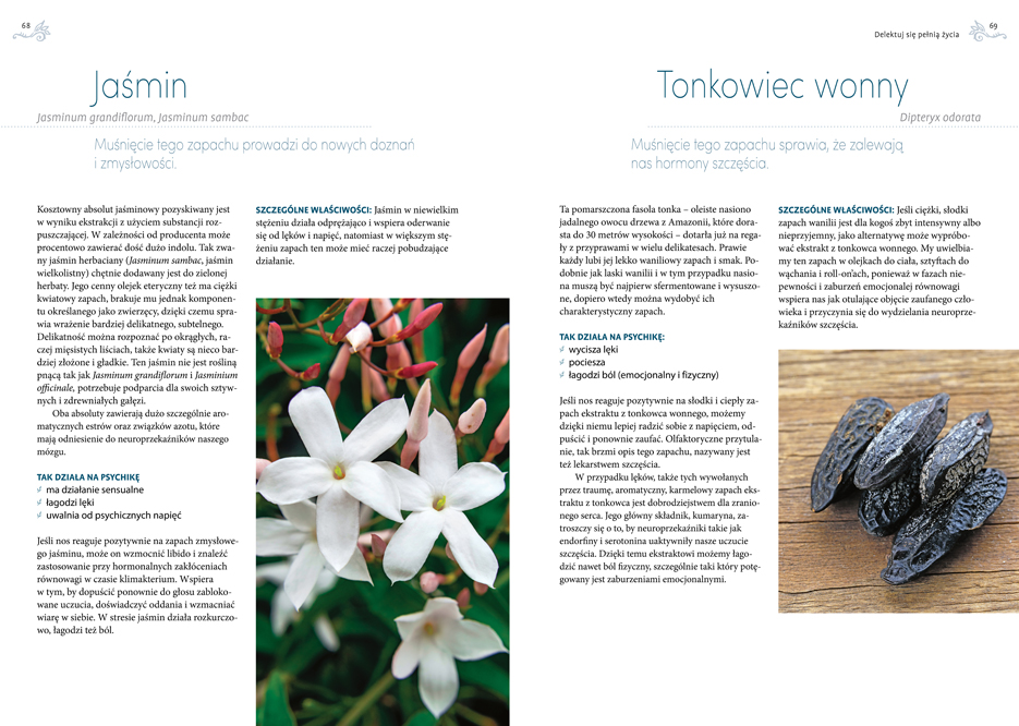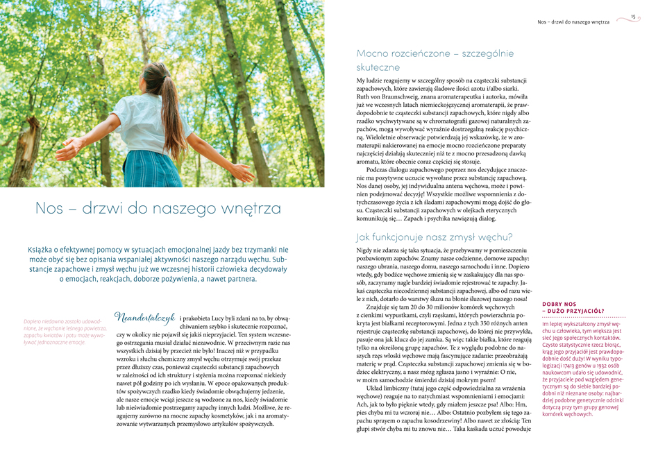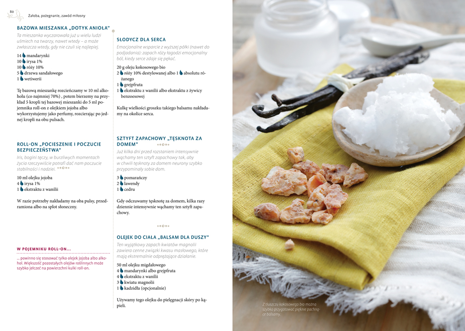 W poradniku szczegółowo opisano składniki zastosowane w olejkach eterycznych (bergamotkę, pomarańczę, liście laurowe, jodłę, sosnę, jałowiec…), w przystępny sposób wyjaśniono, jak one działają oraz w jaki sposób je stosować. Oprócz teorii znajdziemy tu ponad 100 przepisów na olejki eteryczne, które pomogą przepędzić ponury nastrój oraz wewnętrzne napięcie, poprawią samopoczucie i koncentrację, będą wsparciem przy zaburzeniach zasypiania, a także ukoją bóle stawów i mięśni.