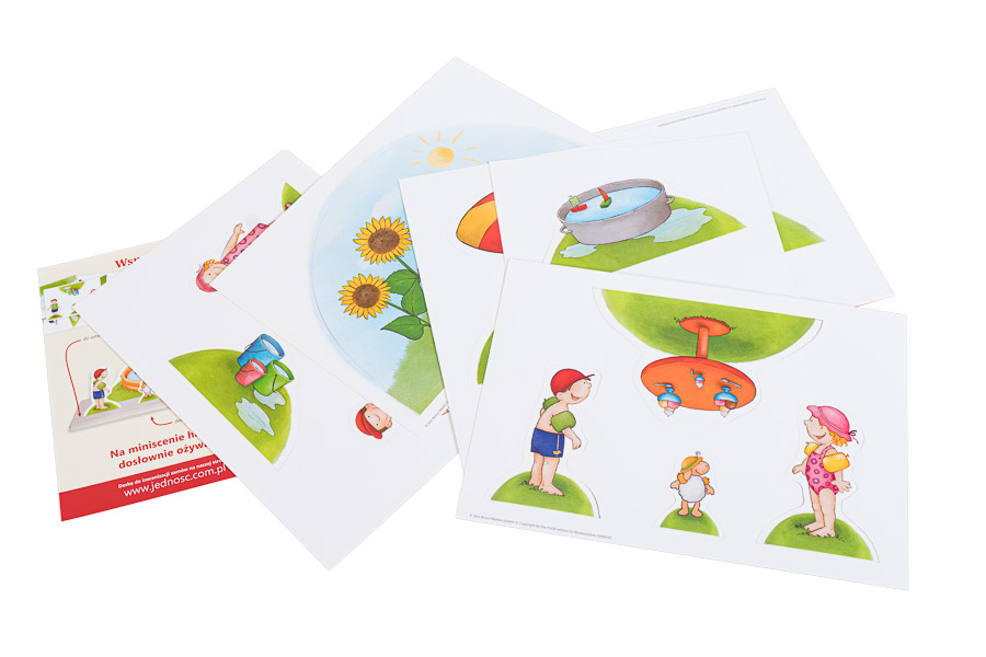 Ustaw scenę-deskę, gdzie tylko chcesz, np. na stole, krześle lub kolanach. Przedstawienie może odbyć się w przedszkolu, szkole, świetlicy lub w domu. Przygotuj figurki i elementy scenografii znajdujące się na luźnych kartach tej książki.