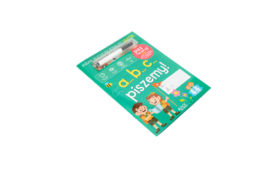 Książka a...b...c... piszemy! powstała z myślą o dzieciach, które zaczynają poznawać litery i uczą się pisać. Odpowiednio przygotowane strony oraz dołączony do książki pisak umożliwiają dziecku opanowanie tych umiejętności. Maluch może ćwiczyć pisanie liter i rozwiązywanie zadań pisakiem suchościeralnym, po czym w każdej chwili zetrzeć jego ślad, aby coś poprawić czy napisać staranniej. Ciekawe i zabawne zadania oraz wesołe rysunki z pewnością zachęcą dziecko do powtórzenia ćwiczeń – i to wiele razy!