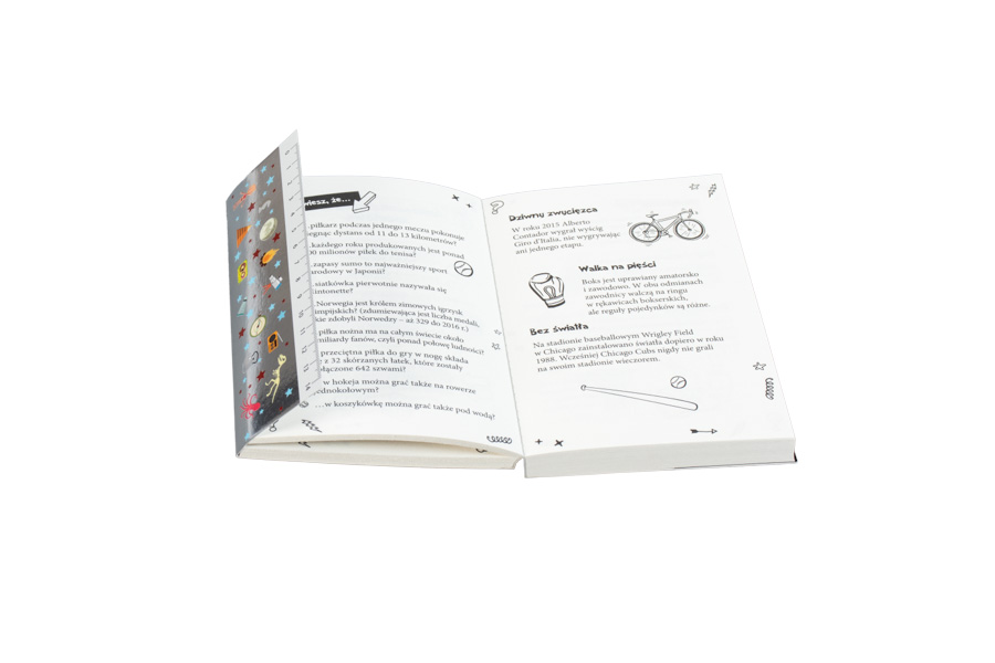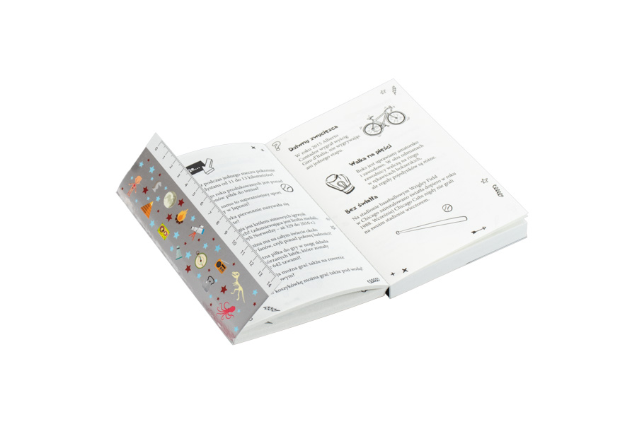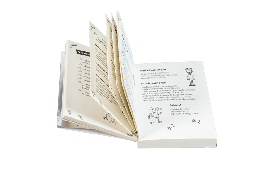 W tej niewielkiej książce, którą można zawsze nosić przy sobie i czytać w każdej wolnej chwili, zmieściliśmy siedem rozdziałów wypełnionych wiadomościami z różnych dziedzin: rośliny i zwierzęta, ciało człowieka, sport, nauka, technika i technologia, geografia i wszechświat, sztuka, kultura i obyczaje, historia. Uzupełniają je zabawne czarno-białe ilustracje.