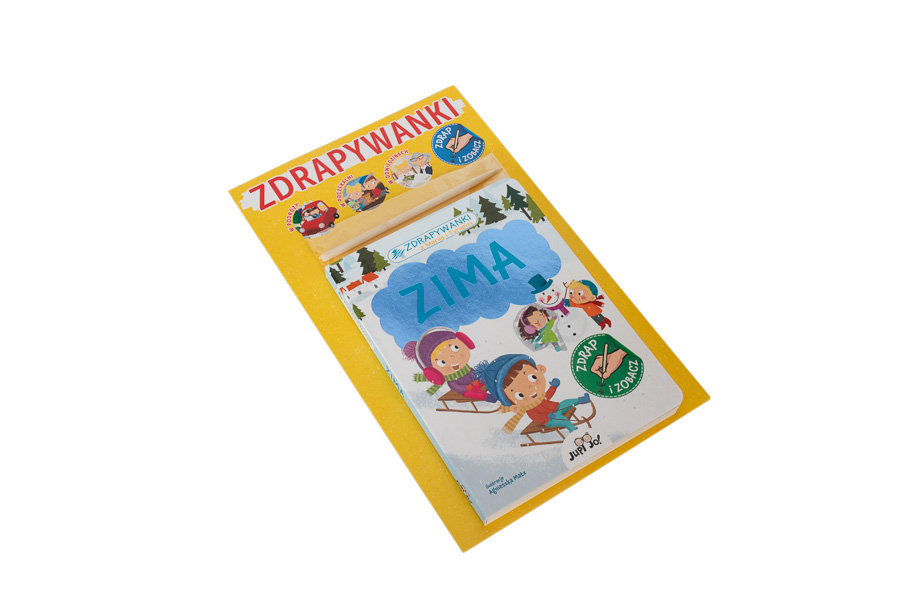 Zdrapywanki z Manią i Tyniem. Zima ma poręczny format i poprzez zabawę wspiera rozwój manualny najmłodszych. Używając patyczka, dzieci zdrapują srebrną farbę i odkrywają całą ilustrację. To doskonały trening koncentracji. Dzieci, towarzysząc bohaterom, poznają zimę i jej oznaki. Będą bawić się na śniegu, piec pierniczki i pojadą w góry.