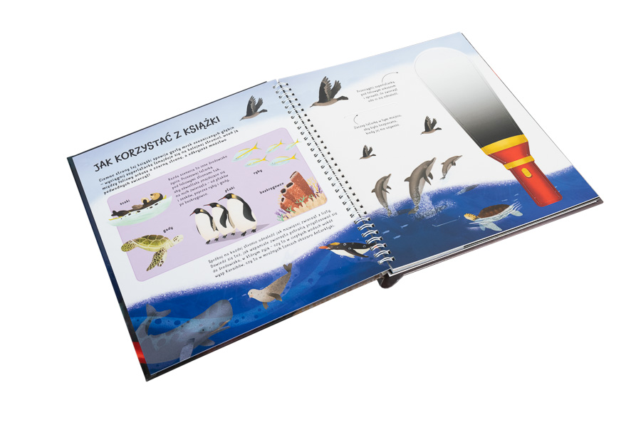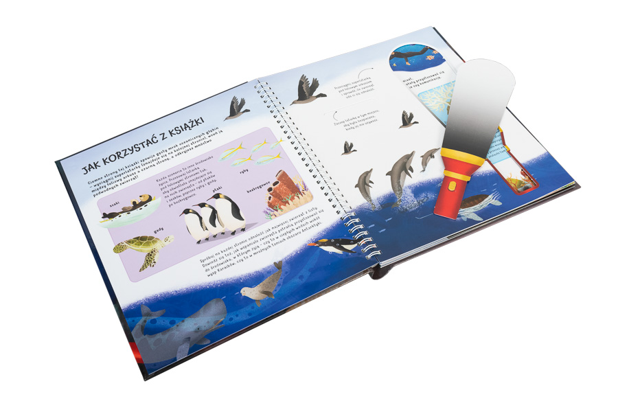 Wypchnij dołączoną do książki kartonową „latarkę”, weź ją do ręki i wsuń między arkusz folii a stronę znajdującą się obok. Zobaczysz, jak niesamowicie wyglądają głębiny oceanu. Zaciemnione strony w tej książce ukrywają fascynujące zwierzęta. Oceany, morza strefy podbiegunowej, australijska rafa koralowa, kalifornijski las wodorostów, tajemnicze wraki statków… – każda scena pokazuje inny obszar podwodnego świata. Wystarczy przesunąć latarką, aby rzucić światło na żyjące tam wspaniałe stworzenia.