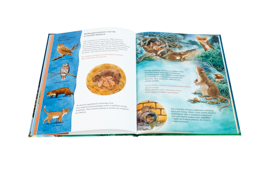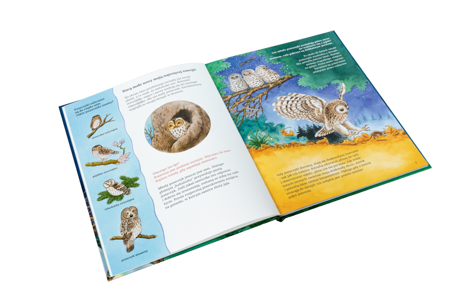 Ta wyjątkowa książka zaprasza na spotkanie z otaczającą nas przyrodą. Bliskie rzeczywistości, piękne ilustracje przedstawiające świat sów i innych zwierząt żerujących nocą oraz przyjazny dzieciom tekst zawierający mnóstwo wiadomości to prawdziwa gratka dla małych badaczy i miłośników przyrody.