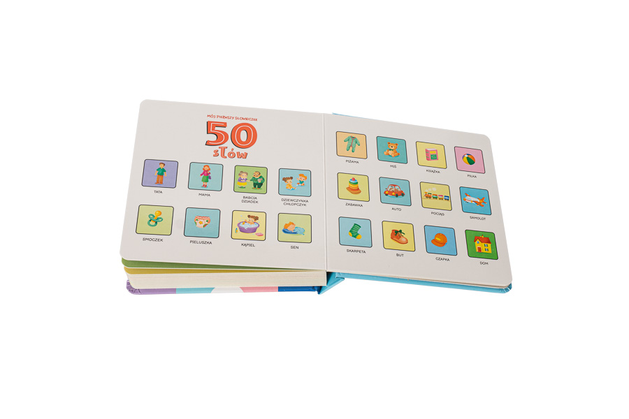 Książka zawiera 50 słów, a każdemu z nich odpowiada urocza ilustracja. Najmłodsi będą patrzeć na obrazki, nauczą się rozpoznawać przedstawione na nich obiekty i wypowiadać ich nazwy. Jest tyle do odkrycia!