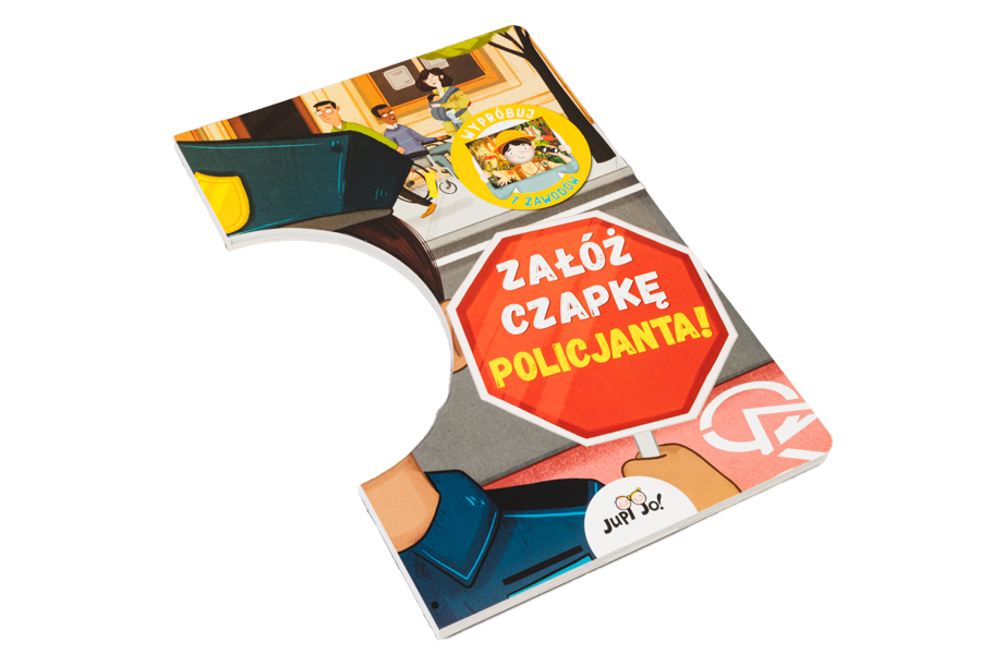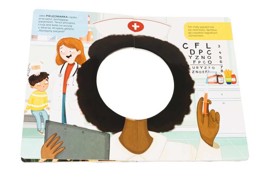 Książka ma wycięty kształt, który idealnie pasuje do dziecięcej buzi. Dzięki niemu dziecko łatwo wcieli się w kolejne postaci i będzie świetnie się bawić! A przy okazji pozna tajniki pracy w różnych zawodach.