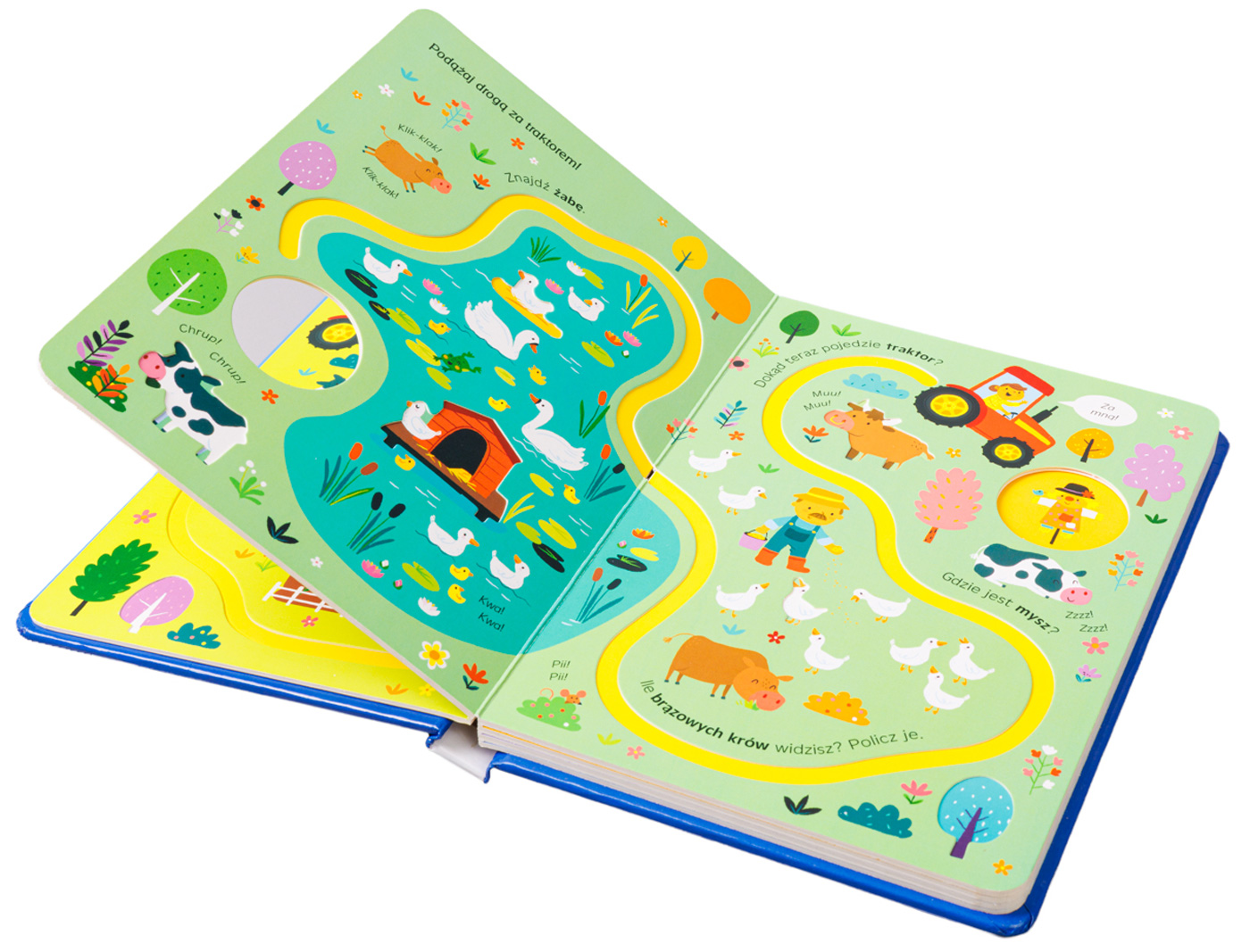 W każdej z nich spotka rżące, kwiczące i beczące zwierzęta gospodarskie! Odpowie na pytania, znajdzie też rzeczy do odkrycia i policzenia. Mały czytelnik będzie dotykał wykrojonych kształtów, a przez wycięte w kartkach dziurki zajrzy na kolejne strony i dowie się, dokąd zmierza traktor!