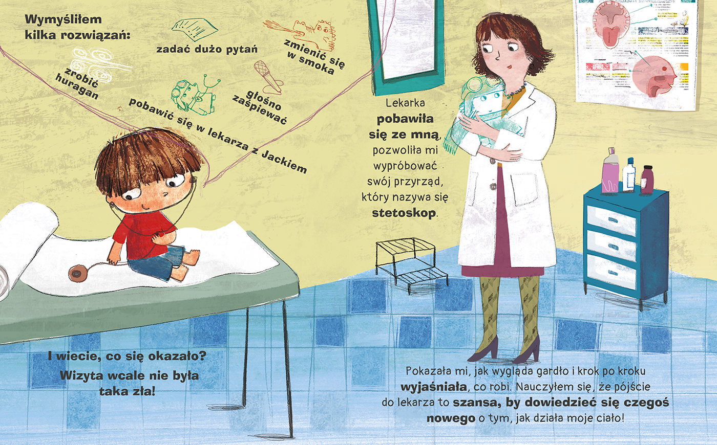 Julek, główny bohater książeczki, podsuwa pięć zabawnych i kreatywnych sposobów, jak poradzić sobie z emocjami, które towarzyszą wizycie u lekarza. Bez trudu może je wypróbować każde dziecko. Publikację wyróżniają świetne ilustracje, naśladujące dziecięce rysunki, które ułatwiają małemu czytelnikowi utożsamienie się z bohaterem. Skupiają one uwagę małych czytelników i pomagają przełamać strach przed badaniem lekarskim.