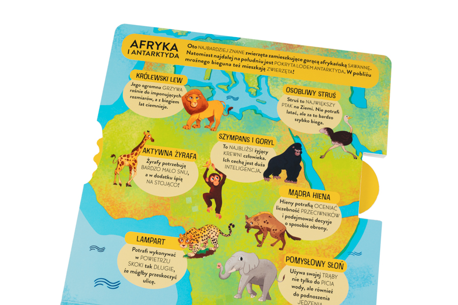 Integralną częścią tej wyjątkowej książki jest umieszczona w okładce gra zręcznościowa, w której dziecko pilotuje samolot lecący dookoła świata i jednocześnie mija różne zwierzęta. Ta zabawa świetnie wpływa na rozwój motoryki, koordynacji i spostrzegawczości gracza. Na kolejnych stronach młody czytelnik pozna zwierzęta zamieszkujące poszczególne kontynenty i odkryje zaskakujące fakty o ich życiu.