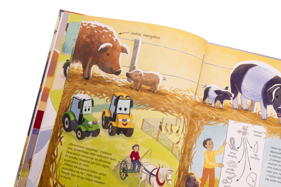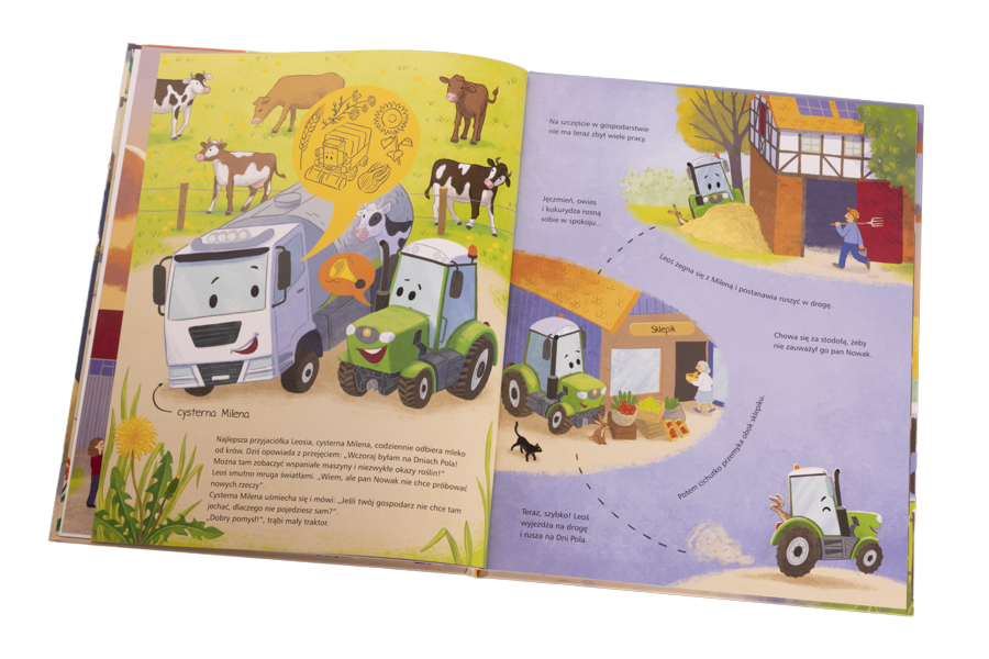 Traktor Leoś żyje na wsi. Codziennie pomaga rodzinie pracowitych rolników w uprawie roślin i hodowli zwierząt. Dzielnie rozrzuca obornik, orze pole, transportuje ciężkie przedmioty…