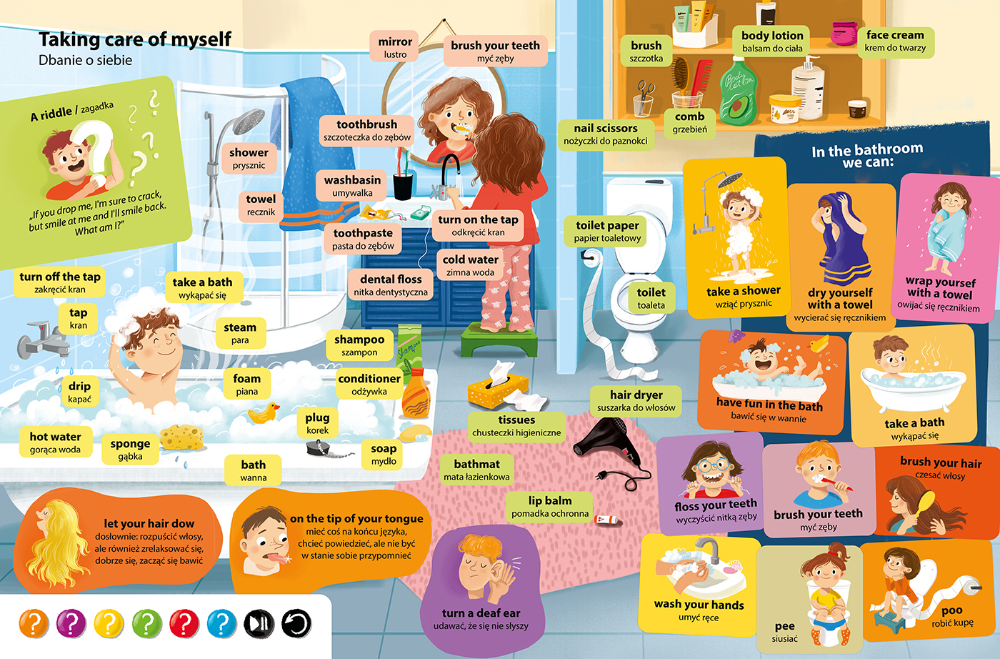 Młody czytelnik rozszerzy swój zasób słów i utrwali wymowę dzięki świetnej oprawie lektorskiej. Pełne humoru ilustracje Beaty Żurawskiej będą nieocenionym wsparciem podczas nauki. W tym interaktywnym słowniczku znajdują się także zabawne łamańce językowe, rymowanki, zagadki i piosenki. Umieszczone przy każdym temacie pytania i polecenia nie tylko rozwiną umiejętności rozumienia słuchanego tekstu, ale także dostarczą dzieciom zabawy oraz informacji o postępach w nauce języka angielskiego.