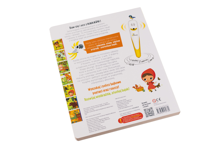 Moje bajki. Wyszukaj i policz to książka interaktywna z piórem Kakadu, które uruchamia zakodowane na stronach teksty i dźwięki. Publikacja jest częścią innowacyjnego systemu nauki i zabawy w jednym.