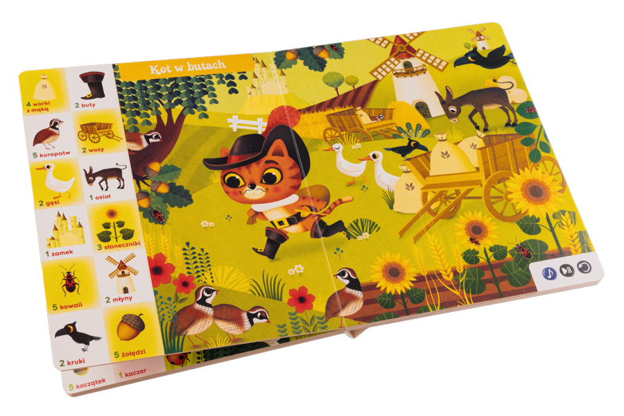 Maluchy bawiąc się, rozwijają spostrzegawczość i nabierają wprawy w liczeniu do pięciu. Poznają także około 100 słów na uroczych i pełnych szczegółów ilustracjach.Dodatkową atrakcją książki są baśnie do słuchania. Wystarczy zbliżyć pióro do odpowiedniej ikonki! Wyszukaj i policz bajkowe postaci oraz rzeczy! Rozwijaj wyobraźnię, słuchając bajek!