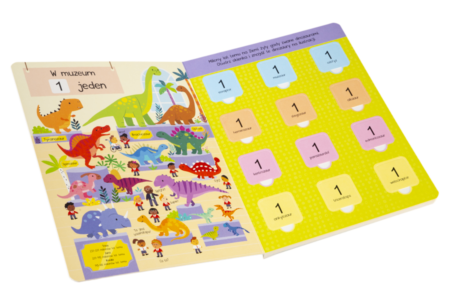Mnóstwo okienek umieszczonych w tej książce z pewnością spodoba się małym odkrywcom dinozaurów, którzy uwielbiają szukać, liczyć i uczyć się! Dzieci poznają nazwy dinozaurów, a także wiele faktów o tych zwierzętach, a następnie sprawdzą swoją wiedzę w formie quizów.