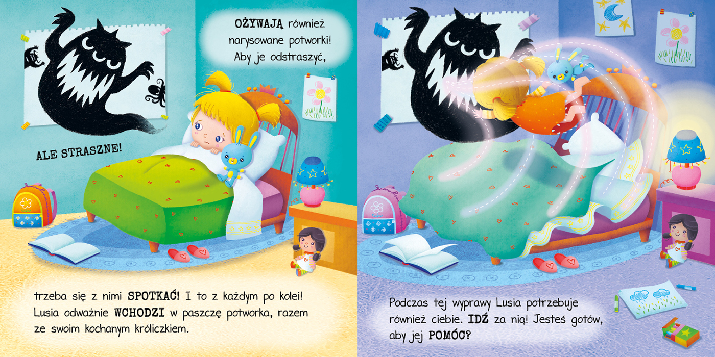 Czy pomożesz Lusi stawić czoła jej lękom? Otwórz tę książeczkę ze strachami i podążaj za Lusią. Wykonuj proponowane zabawy i przepędź wszystkie potwory. Potem zamknij książkę, skoncentruj się i zbierz się na odwagę. Połóż kciuk na krawędzi książki i szybko ją przekartkuj. Zobaczysz, jak potwory znikają z książki… naprawdę! Ale lęk nigdy nie znika całkowicie, trzeba nauczyć się stawiać mu czoła każdego dnia.