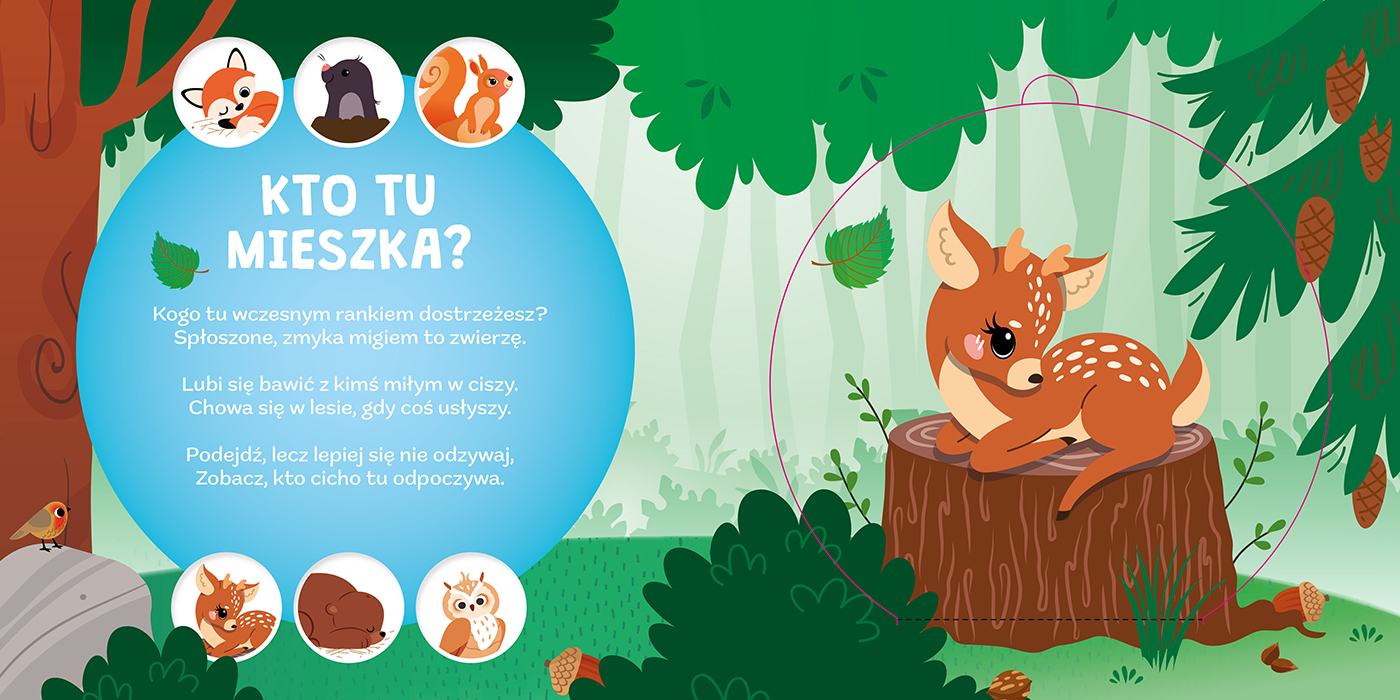 Czy jesteście ciekawi, kto mieszka w lesie? Przekonajcie się, jakie zwierzęta mają swoje domy w dziupli drzewa, w podziemnej jamie albo pośród zielonych gałęzi. Sami będziecie odkrywać wszystkie te miejsca, podnosząc okienka i zaglądając do kryjówki sowy, niedźwiedzia, lisa i innych zwierząt. W odkrywaniu siedzib mieszkańców lasu pomogą wam zabawne rymowanki i piękne ilustracje.