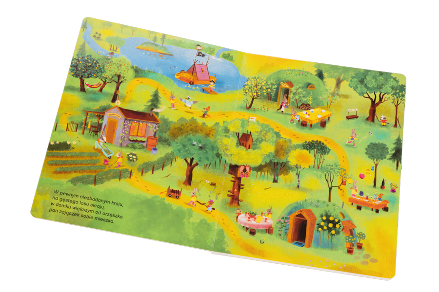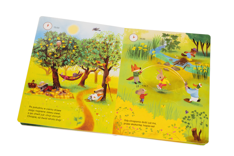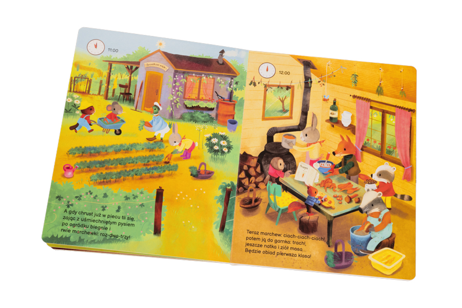 Pełne szczegółów i humoru, całostronicowe ilustracje poprowadzą małego czytelnika przez kolejne godziny i pory dnia. Będzie towarzyszyć zajączkowi od pierwszego dzwonka budzika, poprzez poranną toaletę, wyrywanie marchewek na obiad, wspaniałe zabawy z przyjaciółmi aż po wieczór, na który nasz bohater ma swój plan: