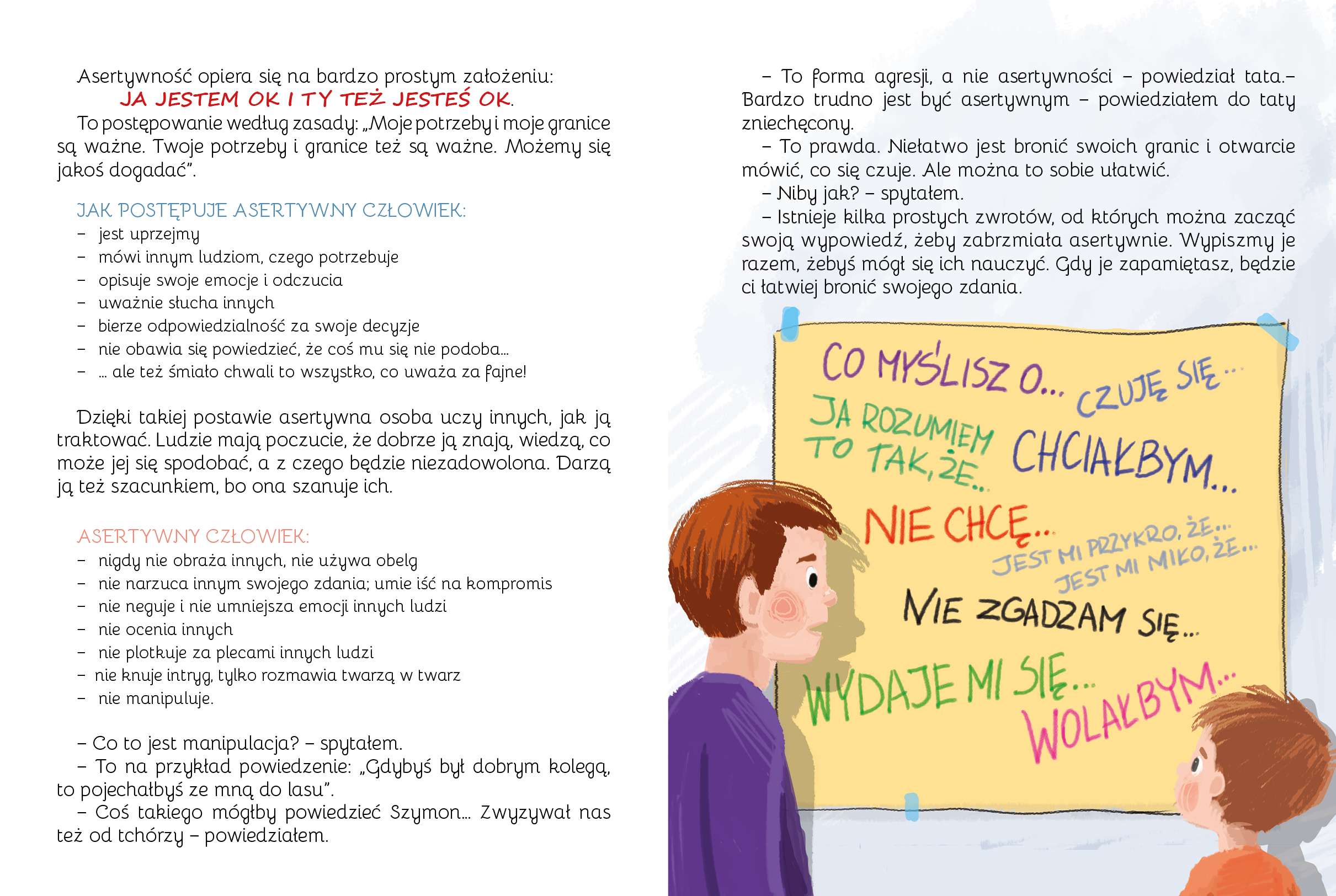 Każdemu czasem trudno jest otwarcie powiedzieć, jak się czuje albo czego mu trzeba, poprosić o pomoc lub odmówić, gdy nie ma na coś ochoty. Kiedy takie sytuacje zdarzają się bardzo często, warto nauczyć się asertywności. Ta książka w przystępny i niezwykle trafny sposób dotyka tematu wyrażania własnych potrzeb i stawiania granic, a także szanowania uczuć i granic innych ludzi. Opisuje typowe sytuacje z życia dzieci i podsuwa wiele praktycznych porad. Wszystko po to, by pomóc dzieciom żyć w zgodzie ze sobą. Dorosłym zaś daje impuls do wspierania dziecka w przyjmowaniu asertywnych postaw.