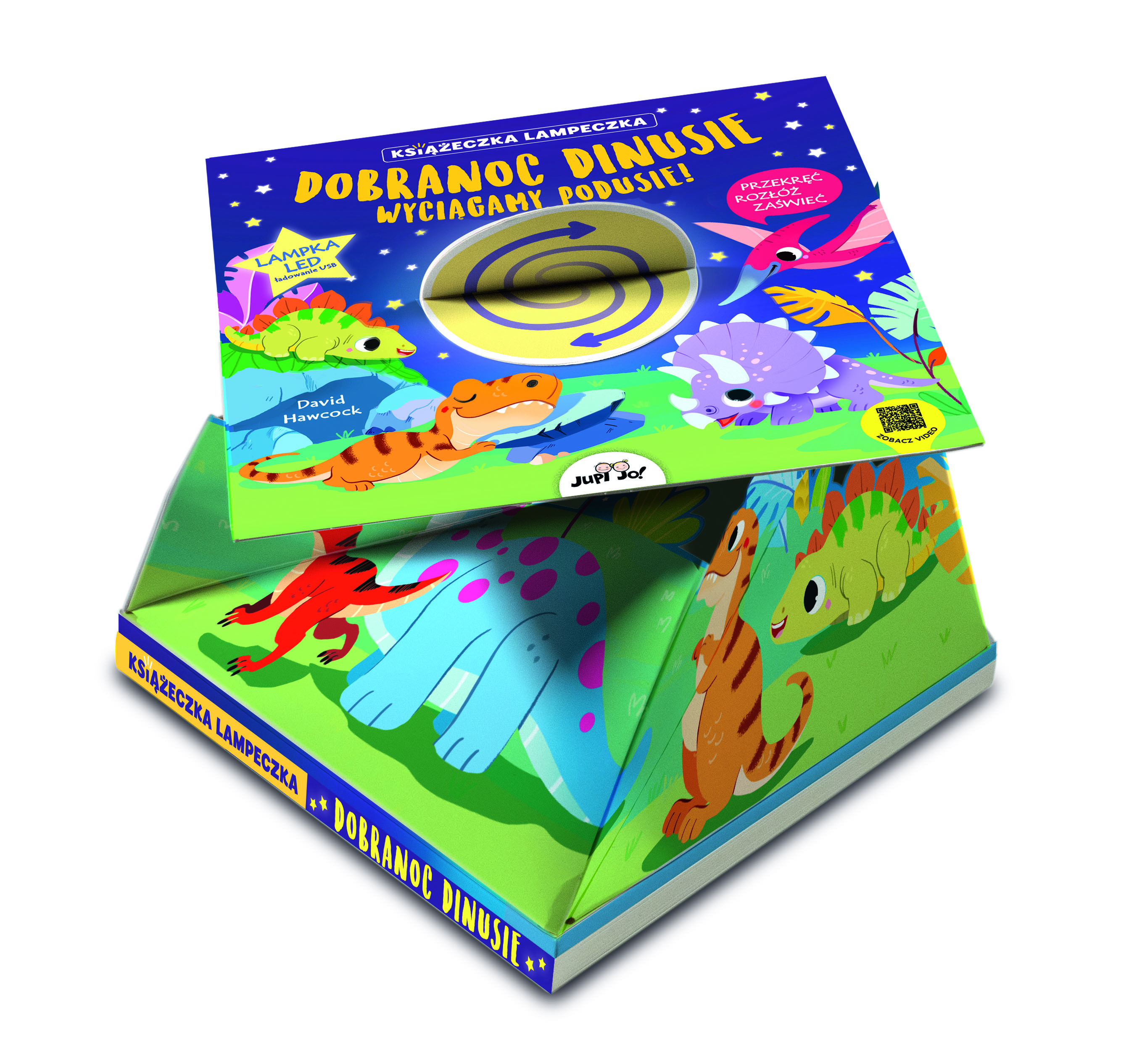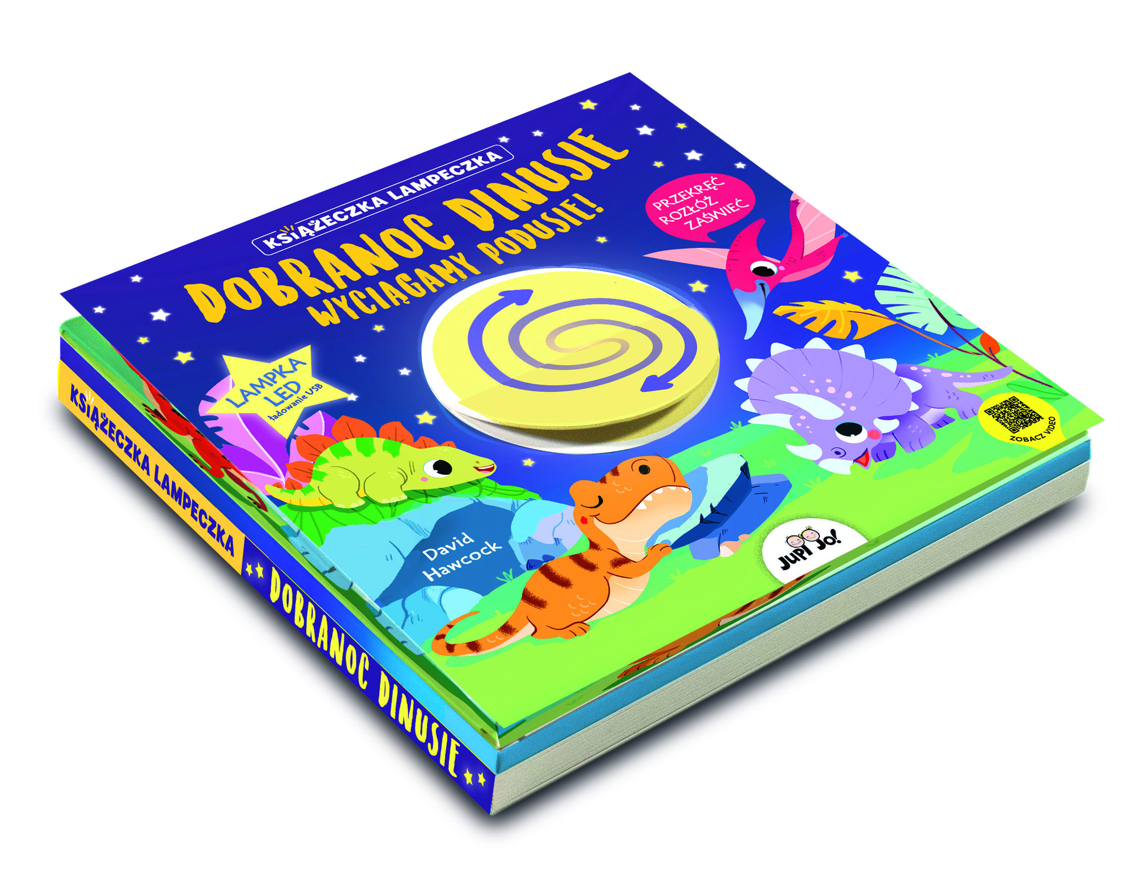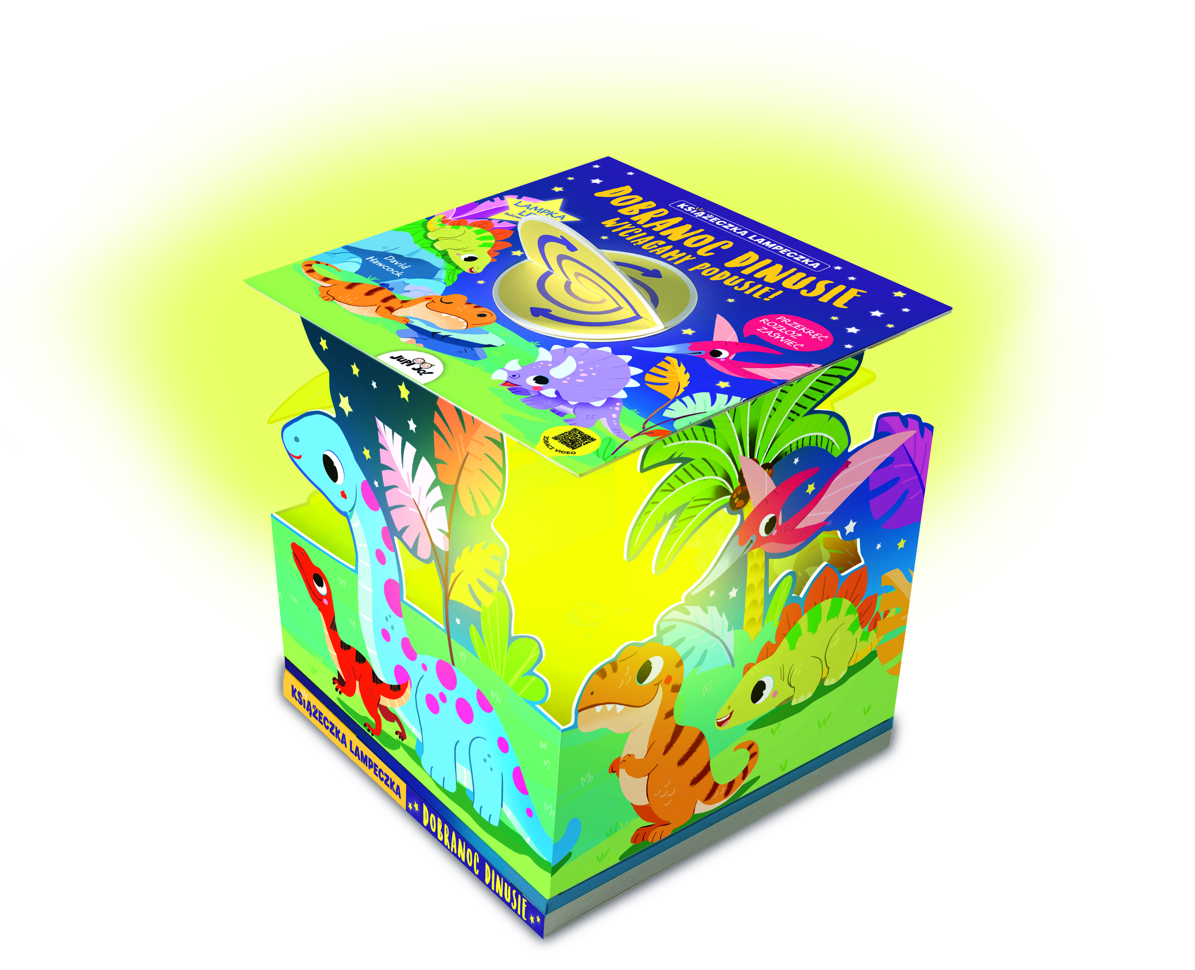 Wystarczy przekręcić i pociągnąć okrągły element na okładce, a sypialnia maluszka natychmiast się rozświetli! W książce znajduje się osiem słodkich rymowanek o dinozaurach, które pomogą dzieciom przygotować się do snu, a delikatne światło lampki będzie towarzyszyło im podczas zasypiania. Fluorescencyjne detale na okładce pozwolą zobaczyć książkę nawet w ciemności!