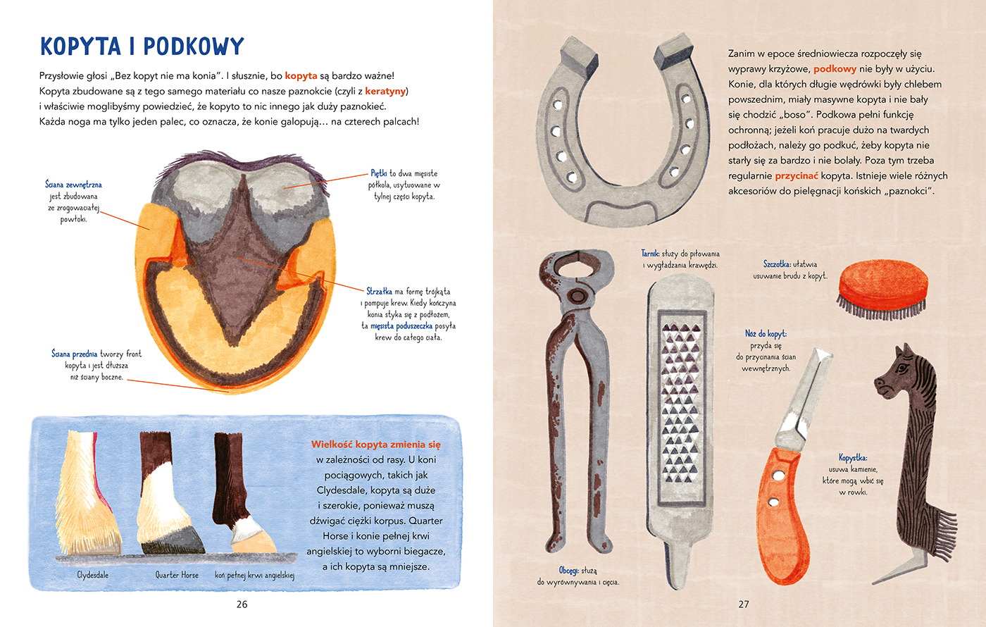 Oto fascynująca książka dla miłośników koni. Każdy jej rozdział porusza jeden z rozmaitych tematów związanych z tymi niezwykłymi zwierzętami. Towarzyszą im przepiękne, malarskie ilustracje, które nadają książce niepowtarzalny klimat. Młody czytelnik dowie się z niej, jak zbudowane są konie, jakie mają umaszczenia, jak nazywają się białe plamy na ich nogach i głowach, a także poczyta o niektórych najbardziej znanych rasach. Przyjrzy się życiu źrebaków oraz dorosłych koni, dowie się, co konie jedzą oraz na co chorują. Niezwykle ciekawą częścią książki są rozdziały opisujące udział koni w naszej kulturze: w malarstwie, literaturze, filmie, przysłowiach, legendach, jak również w historii i sporcie.