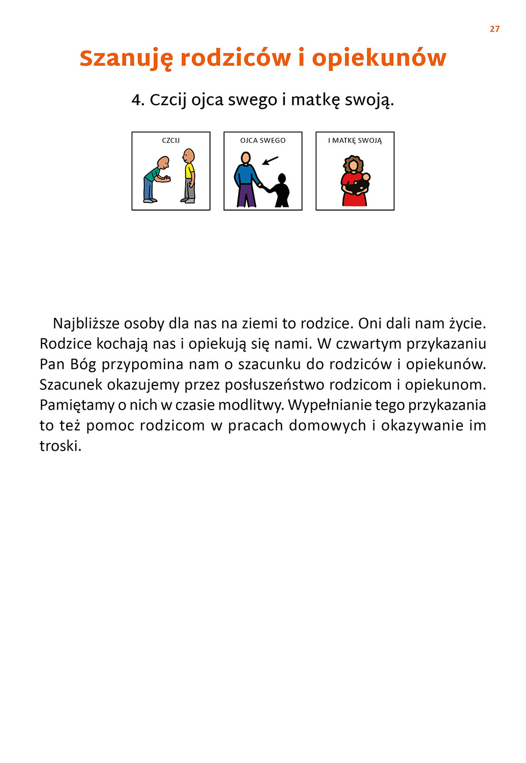 Karty pracy przygotowane z myślą o wszystkich, dla których istotne jest religijne wychowanie dzieci i młodzieży z niepełnosprawnością intelektualną. Za ich pomocą można wprowadzić uczniów w moralność chrześcijańską, omawiając poszczególne przykazania Dekalogu i wyjaśniając ich praktyczne zastosowanie w życiu człowieka wierzącego. Coraz lepsze rozumienie przykazań pozwoli uczniom bardziej świadomie i samodzielnie oceniać moralne aspekty różnych sytuacji życiowych.