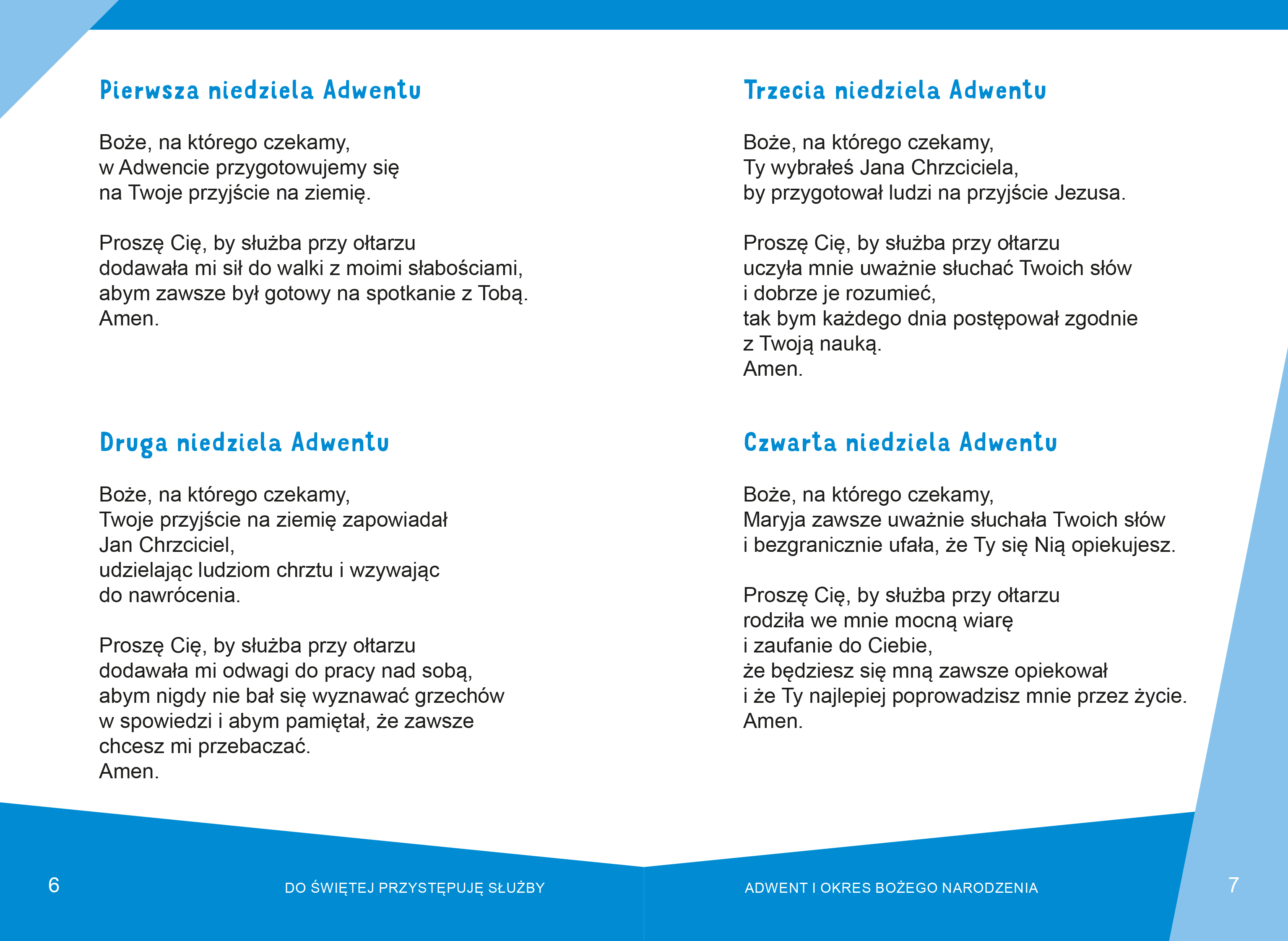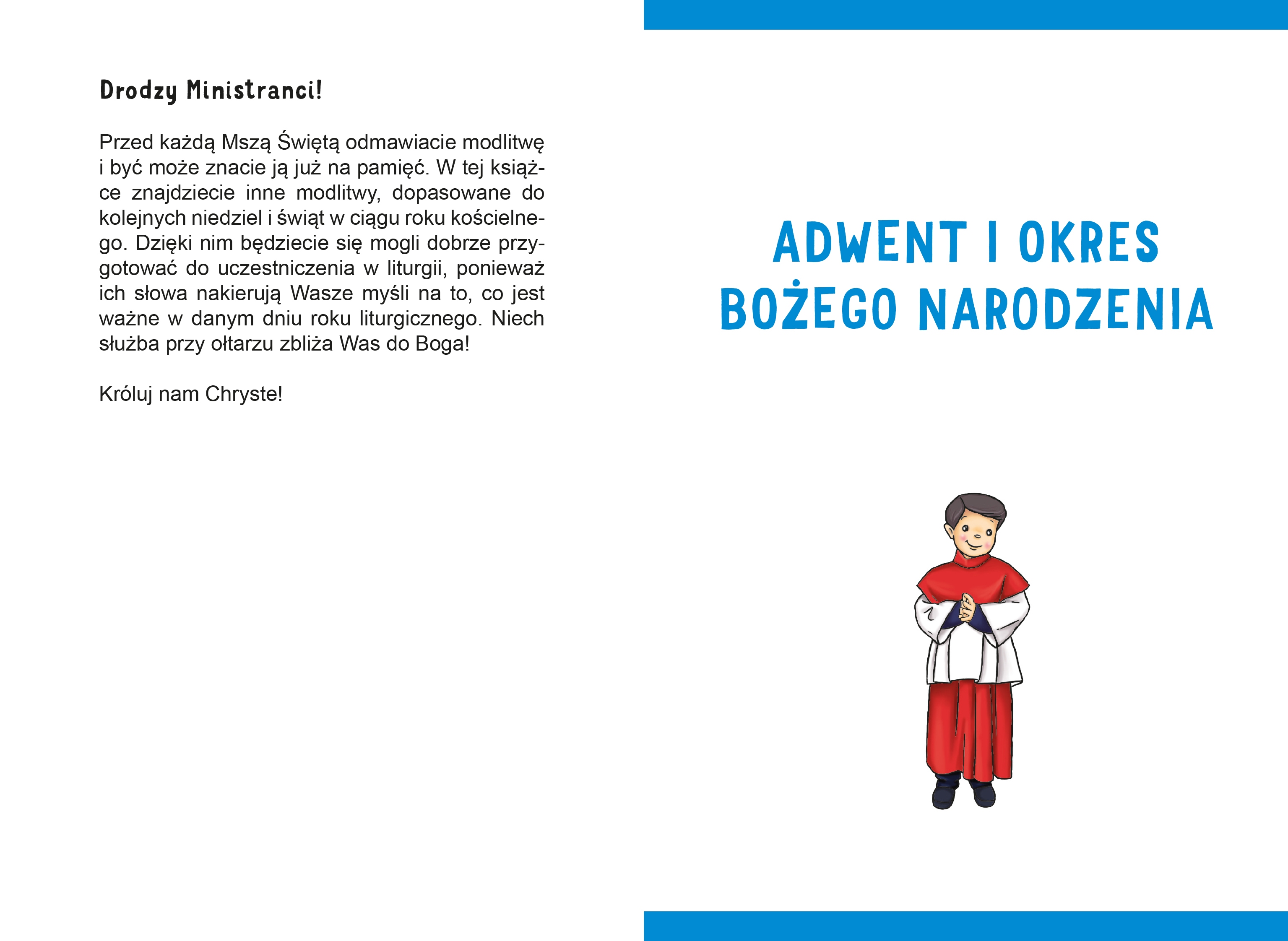 Do każdej Mszy Świętej ministranci przygotowują się, odmawiając modlitwę. Oprócz zwyczajowych formuł, które prawdopodobnie znają na pamięć, mogą również wykorzystać teksty zaproponowane w tym modlitewniku, dopasowane do wszystkich niedziel i najważniejszych świąt w ciągu roku liturgicznego. Są wśród nich również modlitwy przygotowane na Msze okolicznościowe, odprawiane w czasie takich wydarzeń jak Pierwsza Komunia Święta, ślub czy początek roku szkolnego. Przez nakierowanie myśli na to, co jest istotne w danym dniu, modlitwy te pozwolą wszystkim służącym przy ołtarzu lepiej przeżyć każdą Eucharystię.
